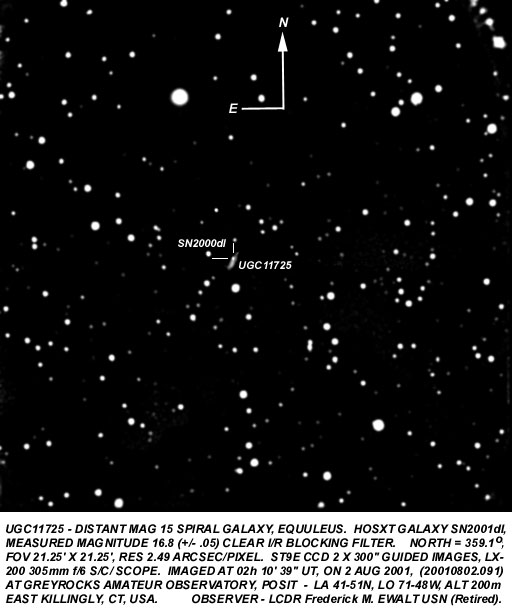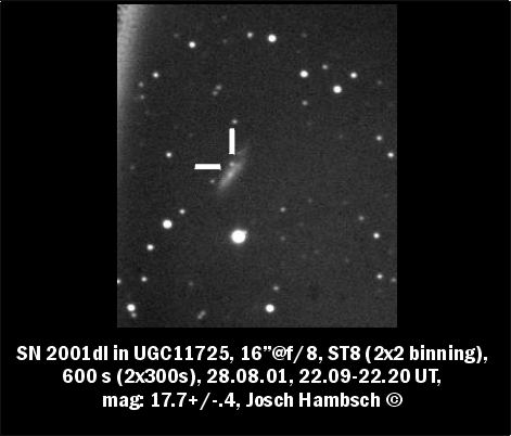 This page is devoted to information on Supernova 2001dl in UGC 11725 Basic information on this SN, including the last reported brightness, on this Supernova can be found on the main page.  Information on the original web pages for many of these images can be found on the updates and links web pages.
