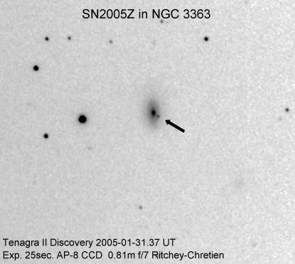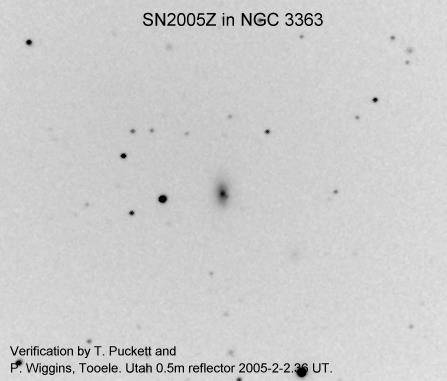 This page is devoted to information on Supernova 2005Z in NGC 3363.   Basic information on this SN, including the last reported brightness, on this Supernova can be found on the main page.  Information on the original web pages for many of these images can be found on the updates and links web pages.
