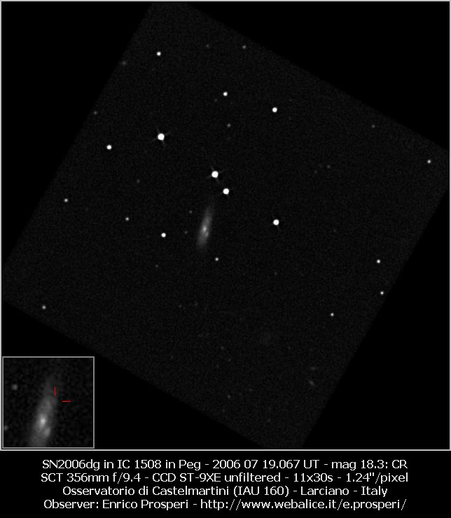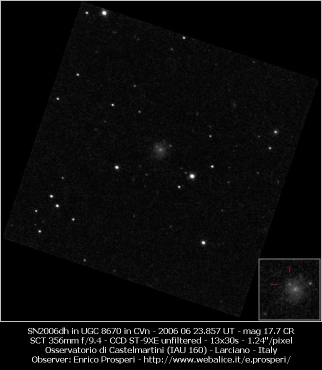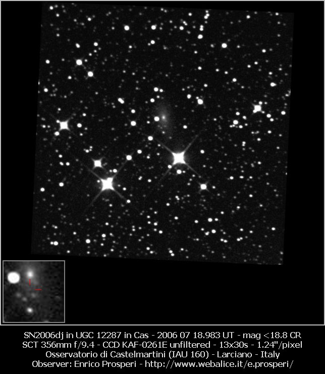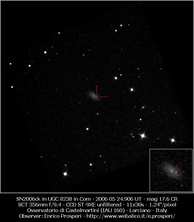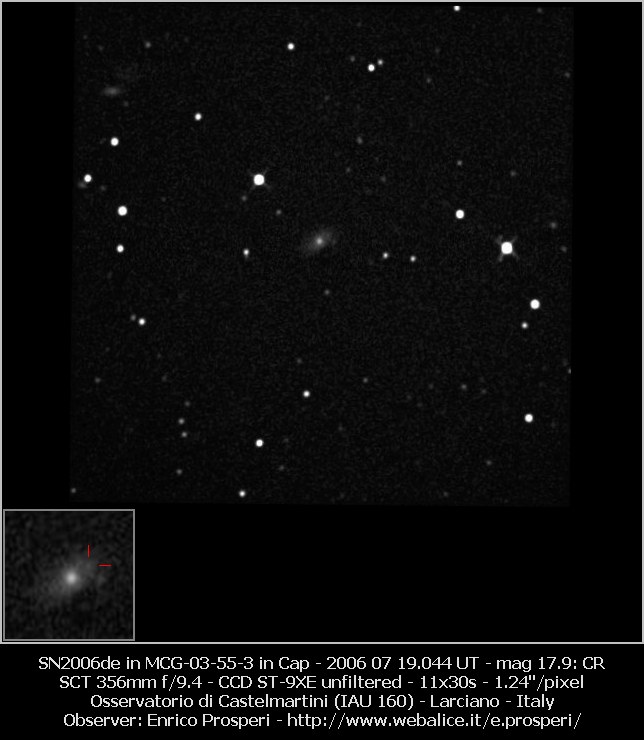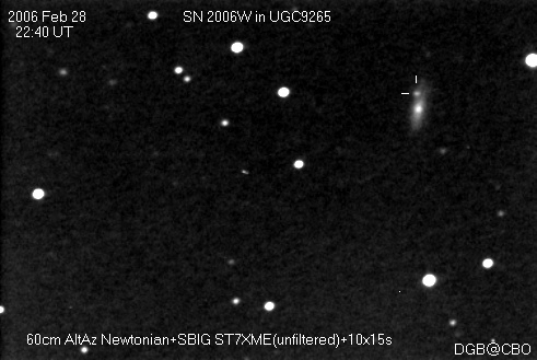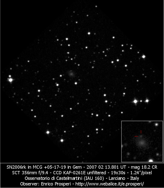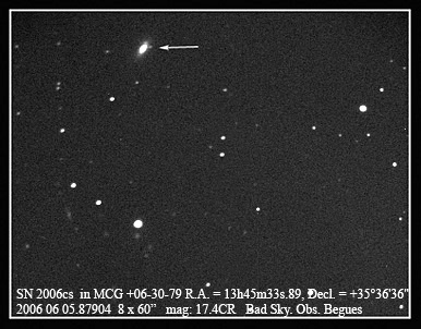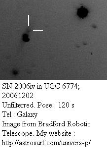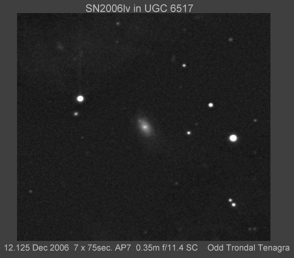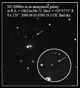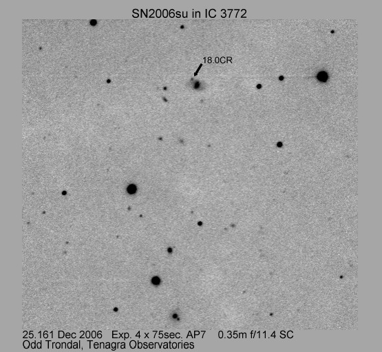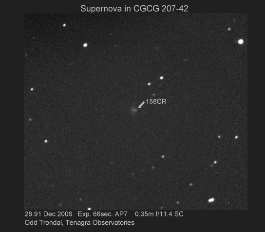 For the year 2006, 554 (a new record!) supernovae have been reported (367 last year).   67 in NGC and IC galaxies (80 last year), 172 got brighter than 18th Mag (149 last year). 27 extragalactic novae were also reported.   The brightest supernovae reported for the year are 2006dd at mag 12.1, followed by 2006ce at mag 12.4, 2006mq at mag 12.7.