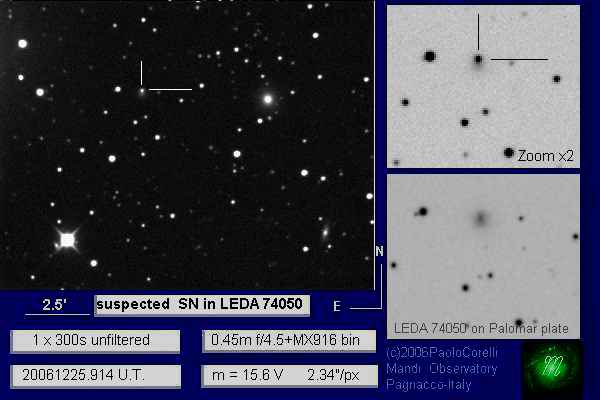This page is devoted to information on Supernova 2006td in LEDA 74050.   Basic information on this SN, including the last reported brightness, on this Supernova can be found on the main page.  Information on the original web pages for many of these images can be found on the updates and links web pages.