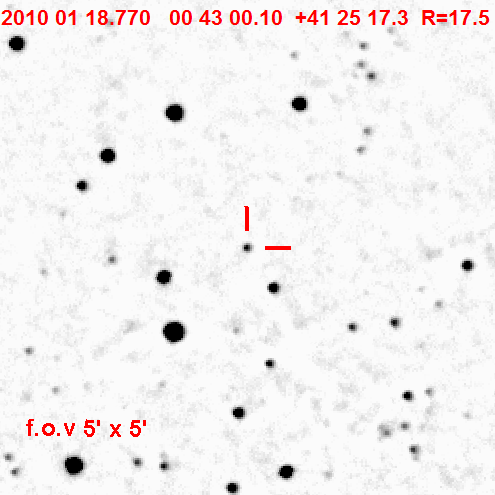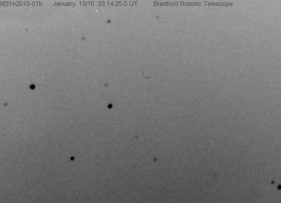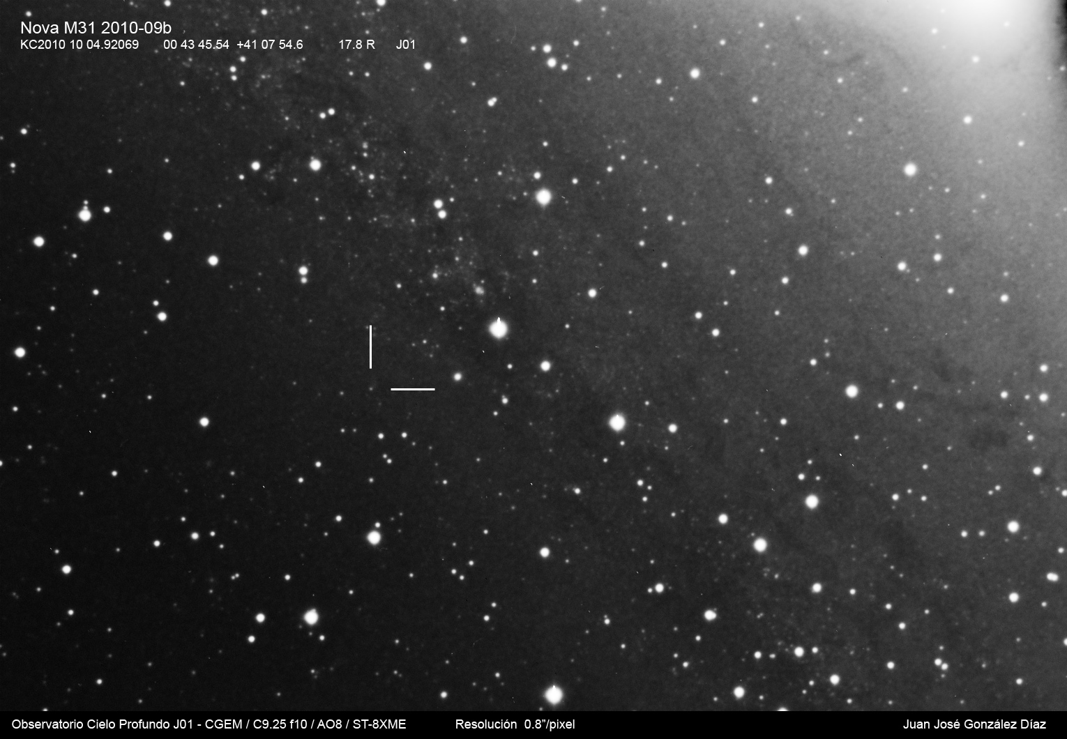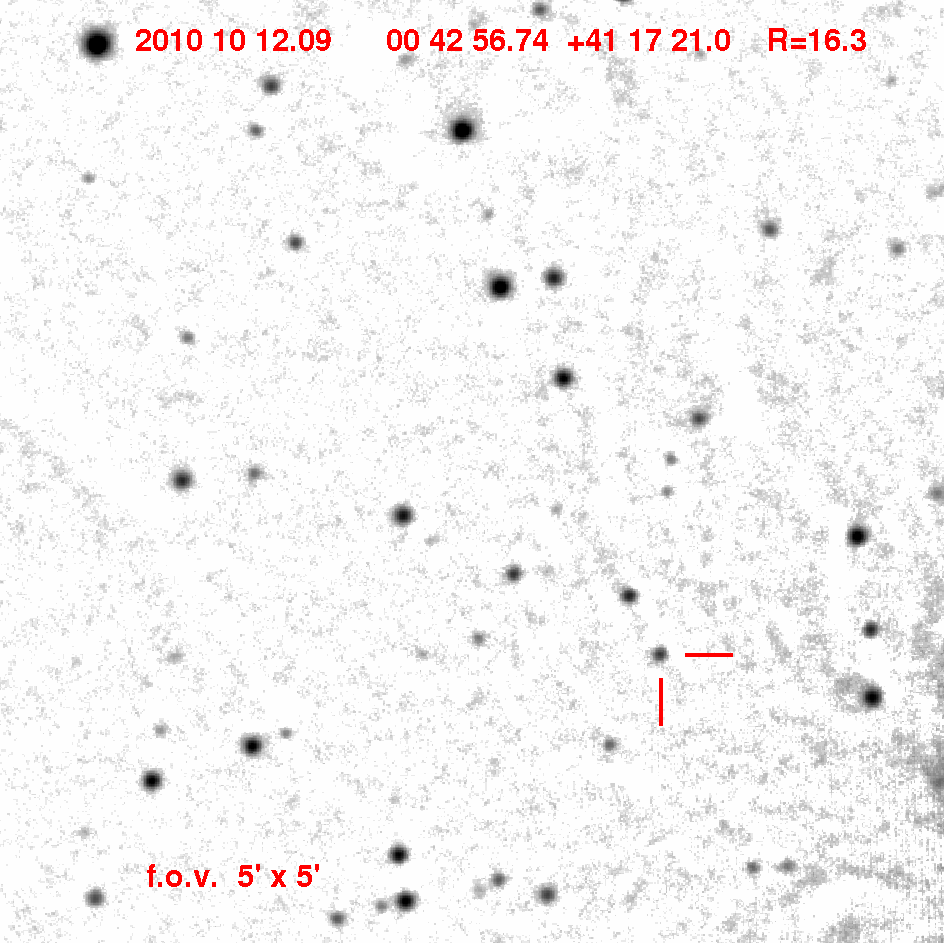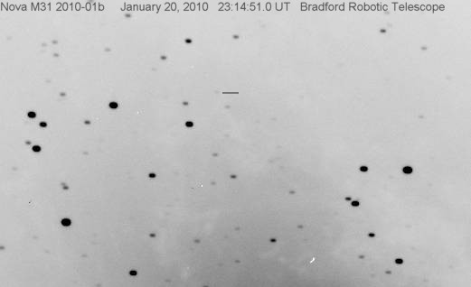 Found in M31 at R.A. = 00h42m56s.67, Decl. = +41°17'21".2 Located 139" east and 73" north of the center of NGC 224 (= M31) (Hornoch discovery image) (Xing Gao discovery image) (T Yusa image) (Joseph Brimacombe image) Mag 17.7 (16.6), Type Extragalactic Nova (References: CBET 2597, CBET 2610, Nova M31 2010-01a)  |