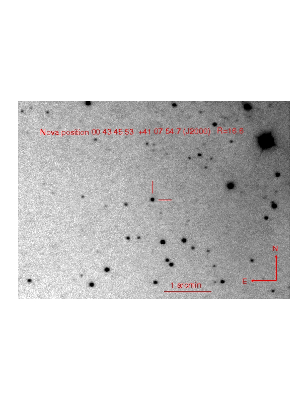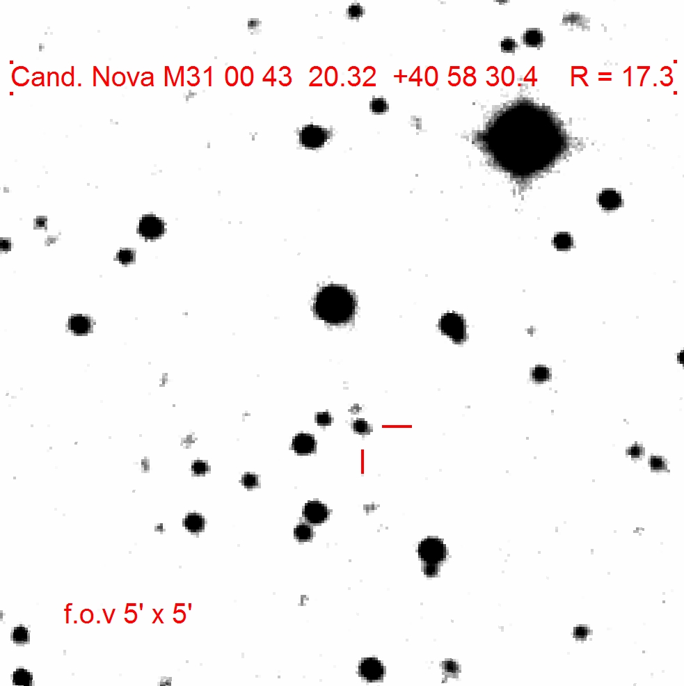 Found in M31 at R.A. = 00h43m45s.53, Decl. = +41°07'54".7 Located 690" east and 494" south of the center of NGC 224 (= M31) (T. Yusa confirmation image) (Wolfgang Pietsch image) (Rafael Ferrando image) (Joseph Brimacombe image) (Rafael Ferrando animation) (Juanjo González image) (Rafael Ferrando image) (Joseph Brimacombe image) (Guoyou Su and Xing Gao image) Mag 18.7 (16.8), Type hybrid Nova (References: ATEL 2896, 2898, 2909, CBAT M31 page)  |