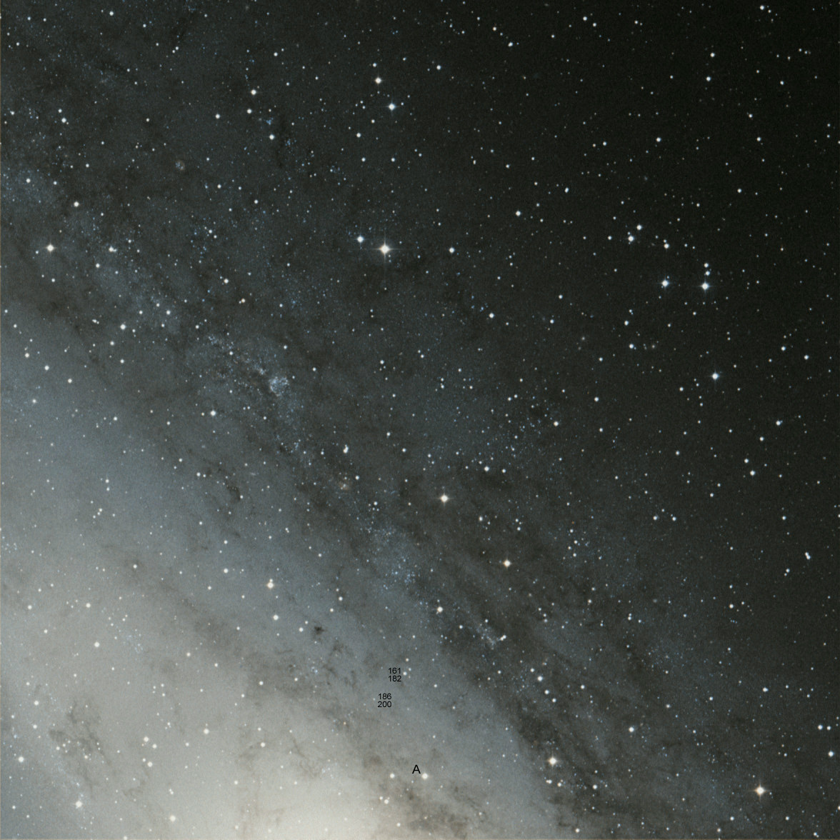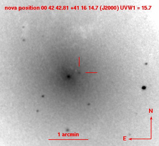 Found in M31 at R.A. = 00h43m20.32s, Decl. = +40°58'30.4" Located 406" east and 1058" north of the center of NGC 224 (= M31) (Vadim Burwitz image) (Joseph Brimacombe image) Mag 17.3, Type Extragalactic Nova (References: CBAT M31 page)  |