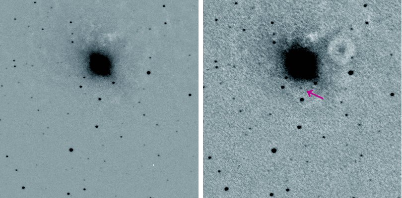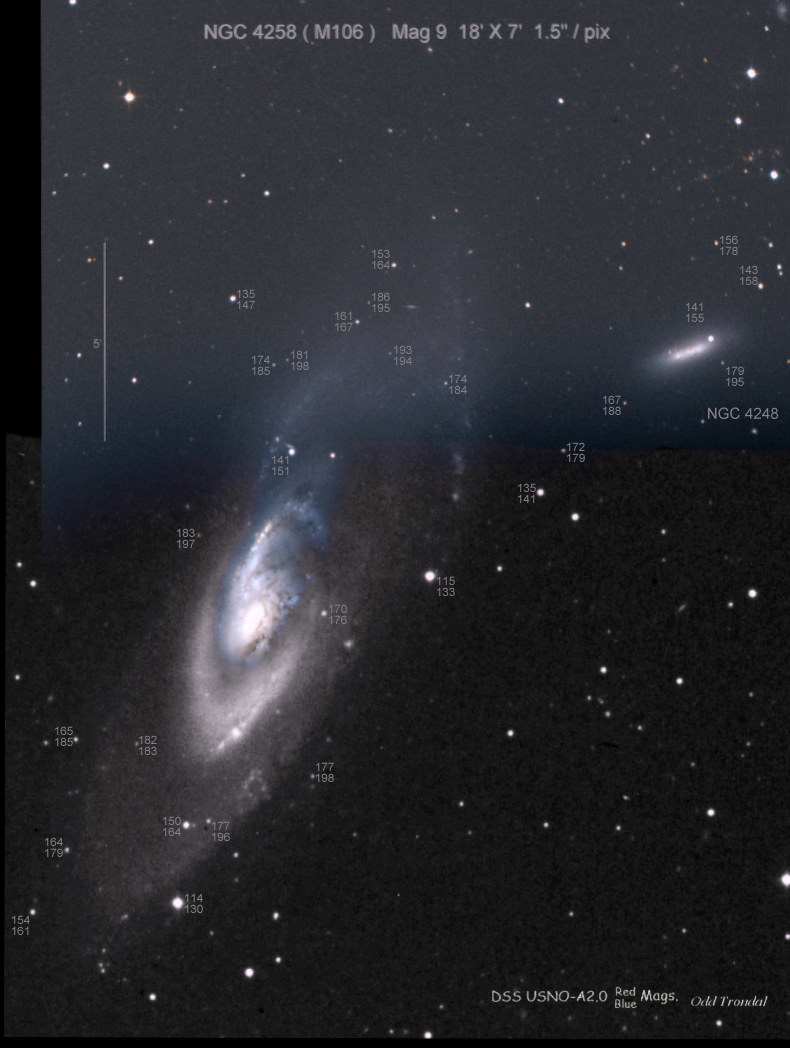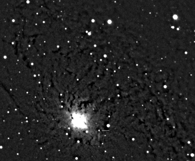 Found in NGC 4258 at R.A. = 12h20m55.22s, Decl. = +46°49'55".5 Located 35" from the the center of NGC 4258 (= M106) (Discovery image) Mag 22.4, Type Extragalactic Nova (References: ATEL 2964>)  |