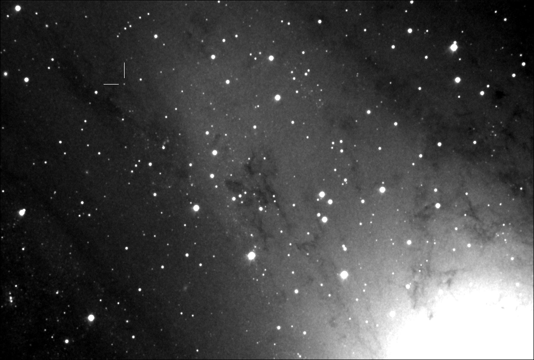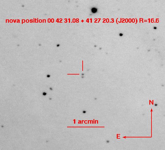 Found in M31 at R.A. = 00h42m44.75s, Decl. = +41°15'11.9" Located 5" east and 57" south of the center of NGC 224 (= M31) (Discovery image) (Azamat Valeev images (gzip)) Mag 17.1R (16.5), Type Extragalactic Nova  |