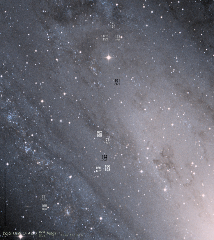 Found in M33 at R.A. = 01h33m27s.55, Decl. = +30°17'28".4 Located 301" west and 1329" south of the center of NGC 598 (= M33) (Ruan and Gao discovery image) (T. Yusa image) (Joseph Brimacombe image (wide field)) Mag 17.5 (16.1), Type FeII Nova (References: ATEL 3063)  |