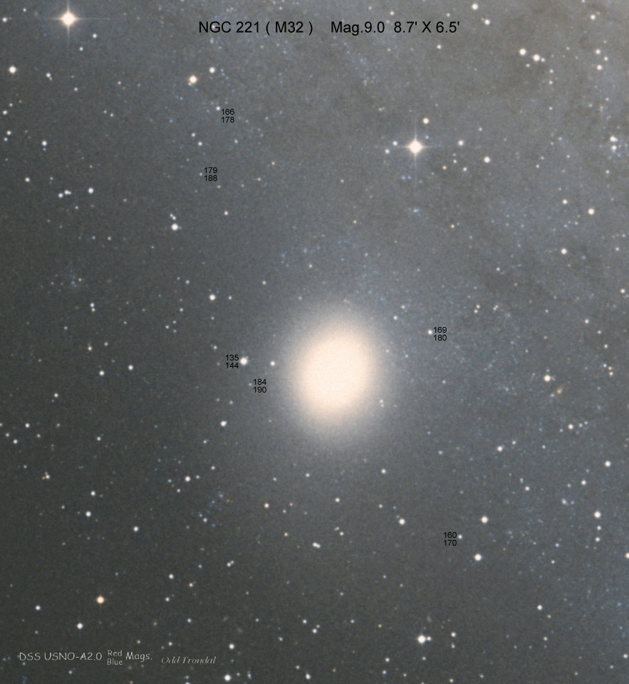 Found in M31 at R.A. = 00h42m57s.74, Decl. = +41°08'12".1 Located 151" east and 476" south of the center of NGC 224 (= M31) (Hornoch discovery image) (Joseph Briacombe image) Mag 19.8 (18.1), Type He/N Nova (References: ATEL 3006, ATEL 3013, ATEL 3038, CBET 2573; Nova M31 1963-09c, CBAT M31 page)  |