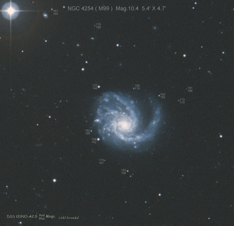 Found in M99 at R.A. = 12h18m50.16s, Decl. = +14°26'39.2" Located 8.1" east and 99.9" north of the center of NGC 4254 (= M99) (Joseph Brimacombe image) (Joseph Brimacombe image color) Mag 20.1, Type Extragalactic Nova (References: ATEL 2595, 2964)  |
