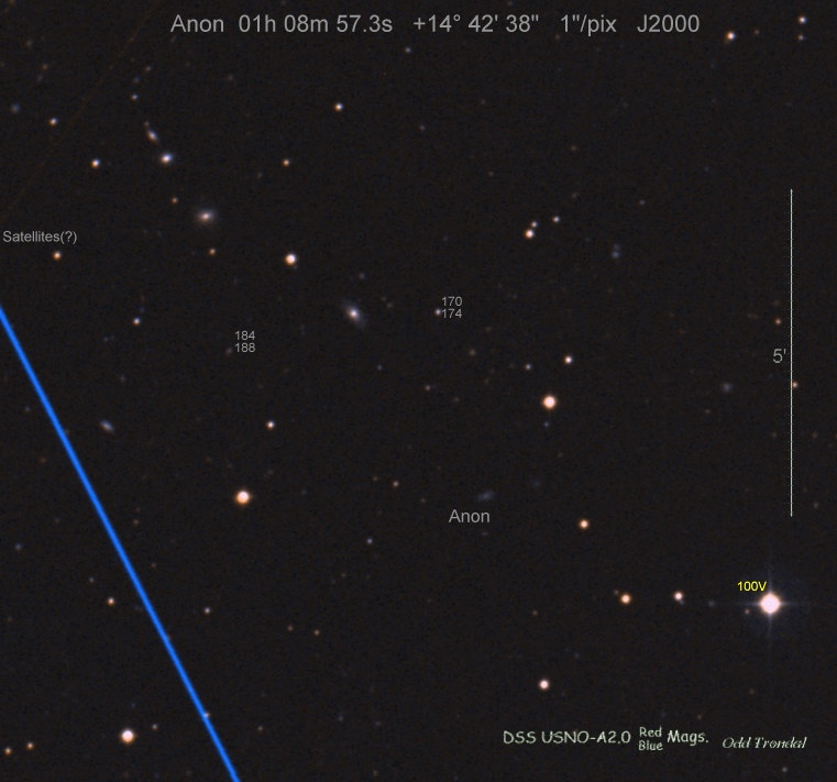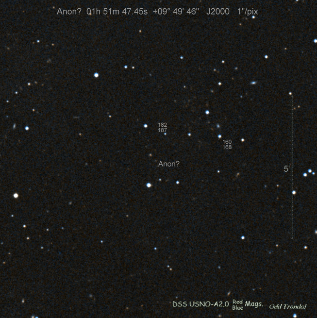 Found in an anonymous galaxy at R.A. = 01h51m47s.45, Decl. = +09°49'46".2 Located 0" east and 0" north of the center of the anonymous galaxy Mag 14.2:12/21, Type Jovan satellite Himalia (solar system object)  |