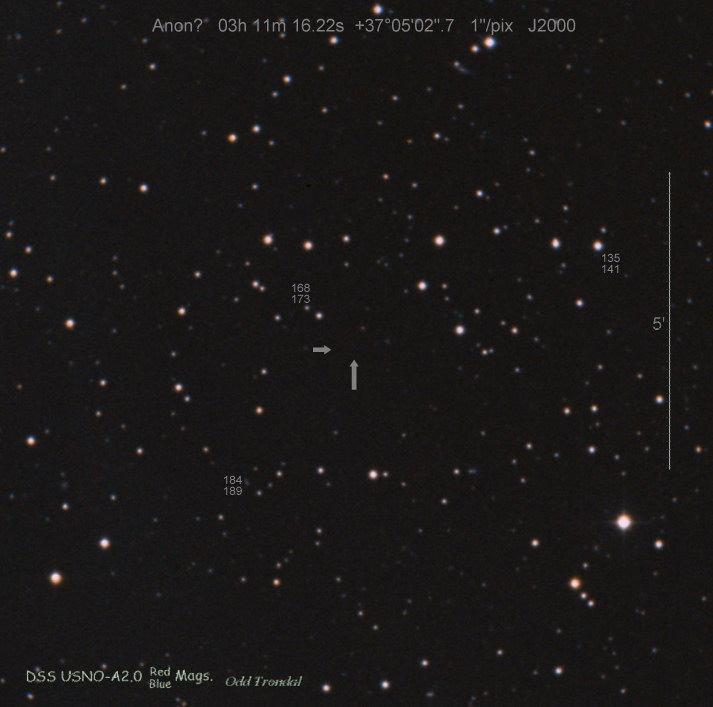 Found in an anonymous galaxy at R.A. = 03h11m16s.22, Decl. = +37°05'02".7 Located 0" west and 0" north of the center of the anonymous galaxy (Discovery image) (Joseph Brimacombe image) Mag 17.9:11/9 (17.5:10/31), Type Galactic Variable  |