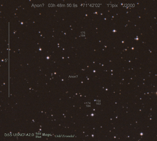 Found in an anonymous galaxy at R.A. = 03h48m50s.93, Decl. = +71°42'02".0 Located 0" east and 0" north of the center of the anonymous galaxy (Discovery image) Mag 16.0:12/1, Type K Star  |