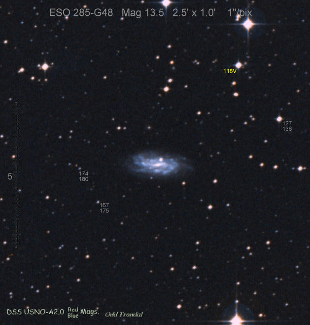 Found in PGC 65299 at R.A. = 20h44m47s.50, Decl. = -45°58'34".0 (= ESO 285-G48) Located 76" east and 12" north of the center of PGC 65299 Mag 15.6**, Type unknown (Berto says that this object is no longer there)  |