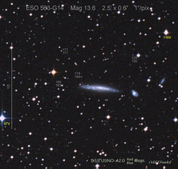 Found in ESO 563-14 at R.A. = 08h42m56s.27, Decl. = -20°03'11".1 Located 12" west and 7" south of the center of ESO 563-14 (Joseph Brimacombe image not confirmed) Mag > 20.0 (18.4), Type unknown (Stu says it's not there, he was effected by the New Zealand Earthquake)  |