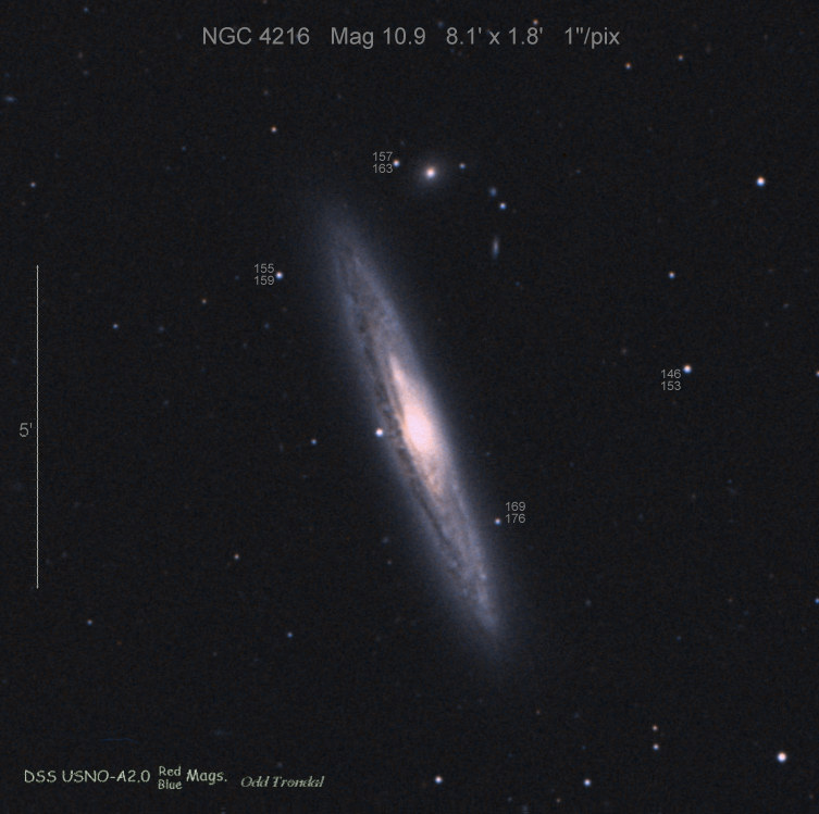 Found in NGC 4216 at R.A. = 12h15m55s.41, Decl. = +13°09'00".4 Located 14" east and 5" north of the center of NGC 4216 (Discovery image) (Joseph Brimacombe image unconfirmed) Mag 13.3**, Type minor planet (130) Elektra (not confirmed) (References: [vsnet-campaign-sn 1063], [vsnet-campaign-sn 1064])  |