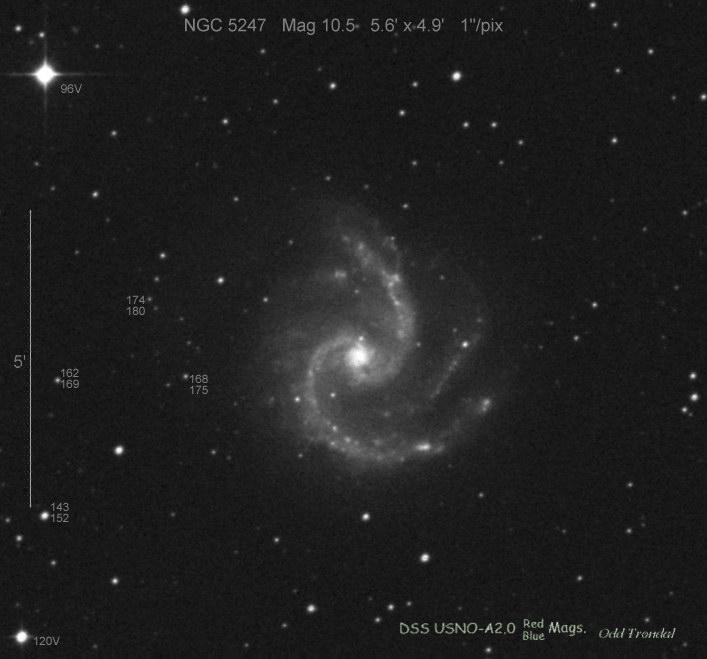Found in NGC 5247 at R.A. = 13h38m04s.15, Decl. = -17°52'54".4 Located 16" east and 7" north of the center of NGC 5247 (Discovery image unconfirmed) (Joseph Brimacombe image unconfirmed) (Joseph Brimacombe image unconfirmed) Mag > 19.5 (17.4), Type unknown (Berto believes this object to be a minor planet)  |