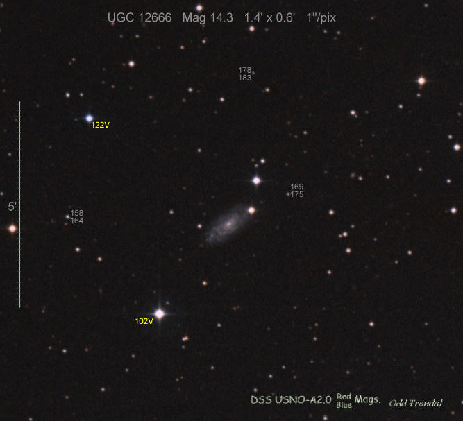 Found in UGC 12666 at R.A. = 23h33m40s.58, Decl. = +32°23'09".3 Located 5" west and 0" north of the center of UGC 12666 (Joseph Brimacombe image unconfirmed) Mag 18.4, Type unknown (object not confirmed by discoverer)  |