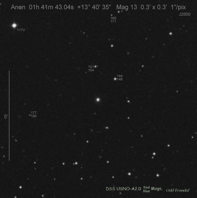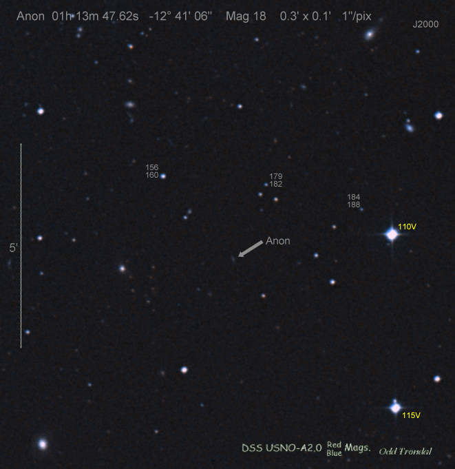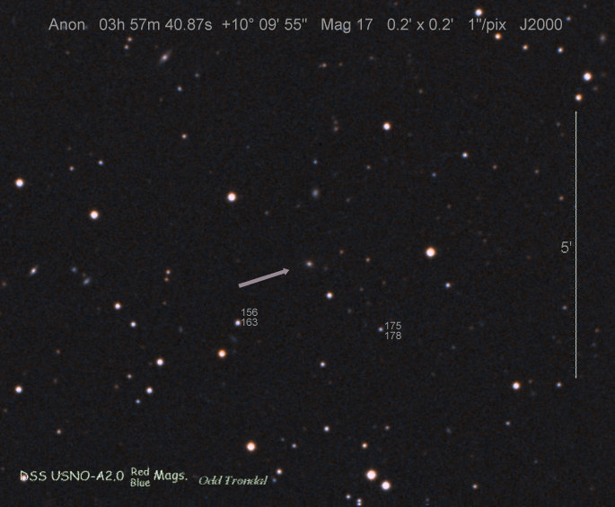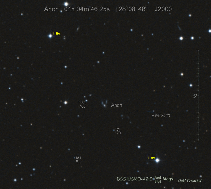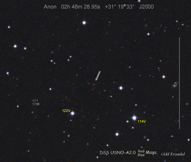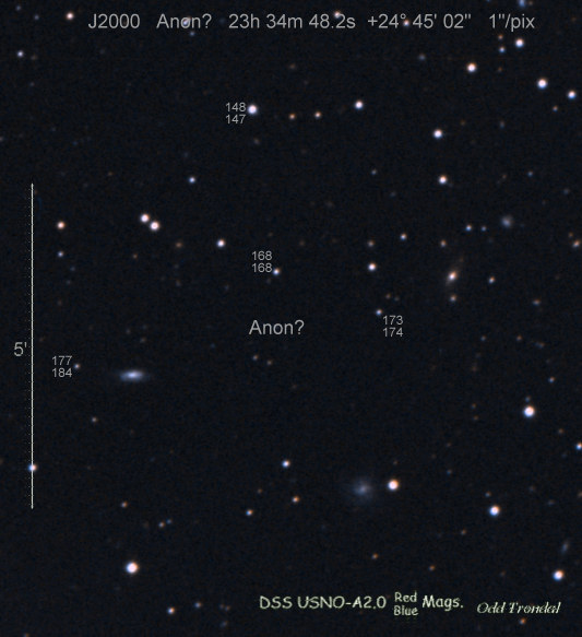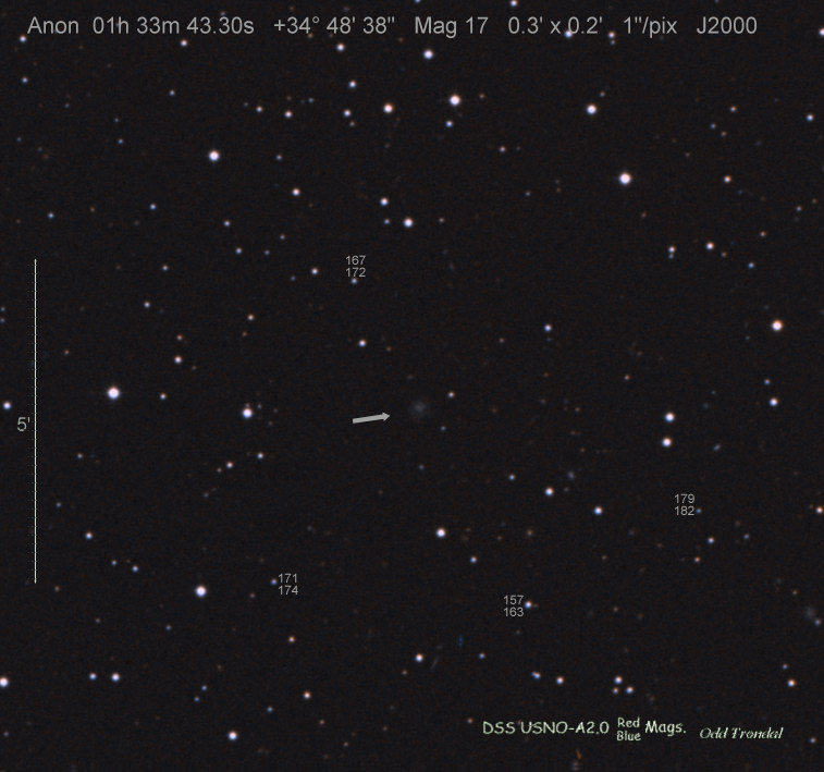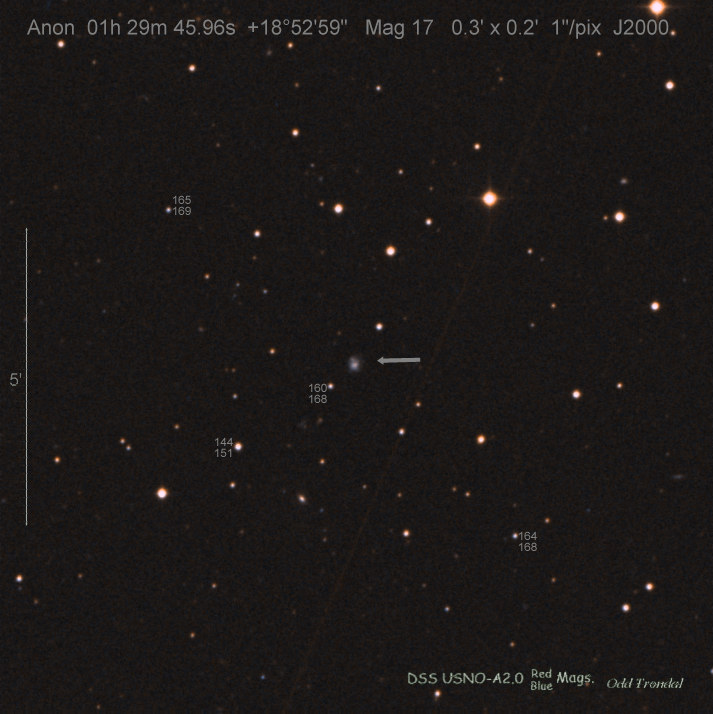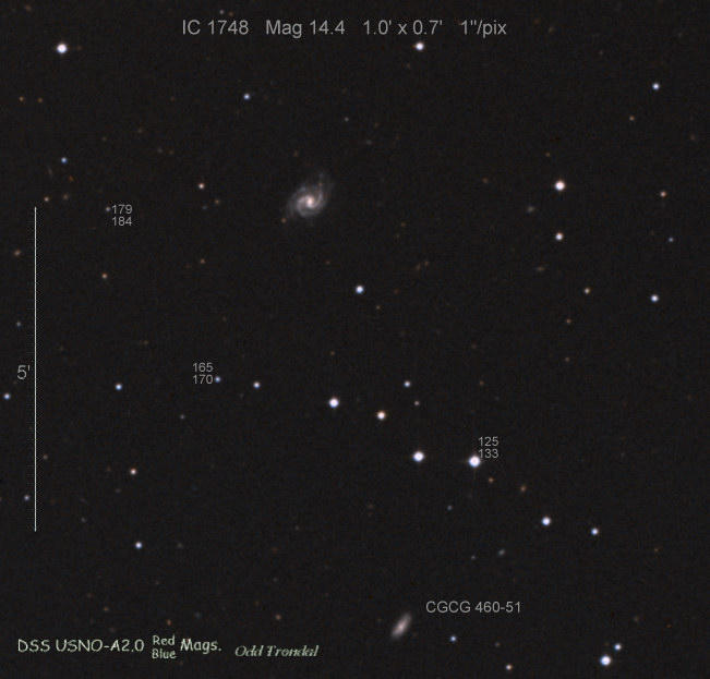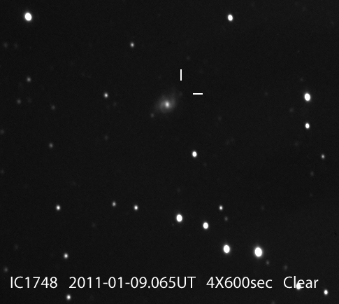 Found in IC 1748 at R.A. = 01h56m07s.19, Decl. = +17°38'46".8 Located 22" west and 16" north the center of IC 1748 (Discovery image) (Stan Howerton image) (Markku Nissinen & Veli-Pekka Hentunen image) (Joseph Brimacombe image) (Joseph Brimacombe image) (Andy Cason image) (Marc Serrau image) (Robert Koff image) Mag 18.5**, Type unknown  |