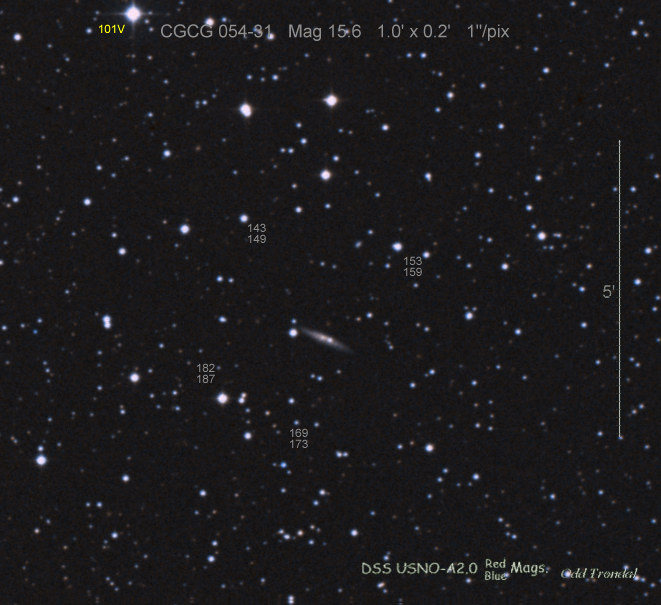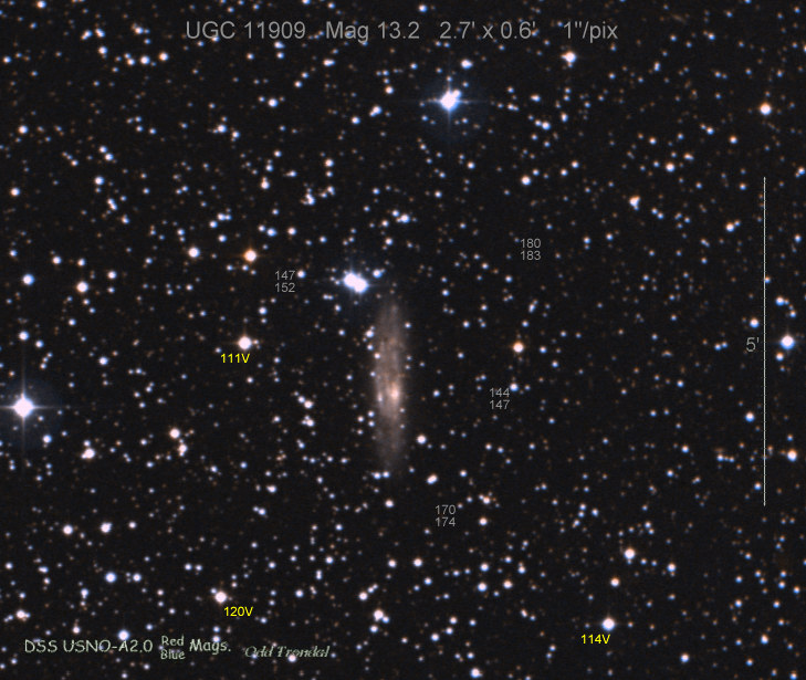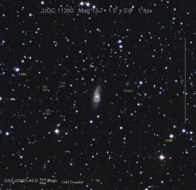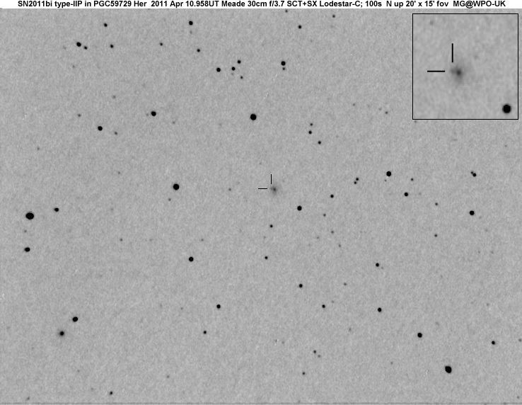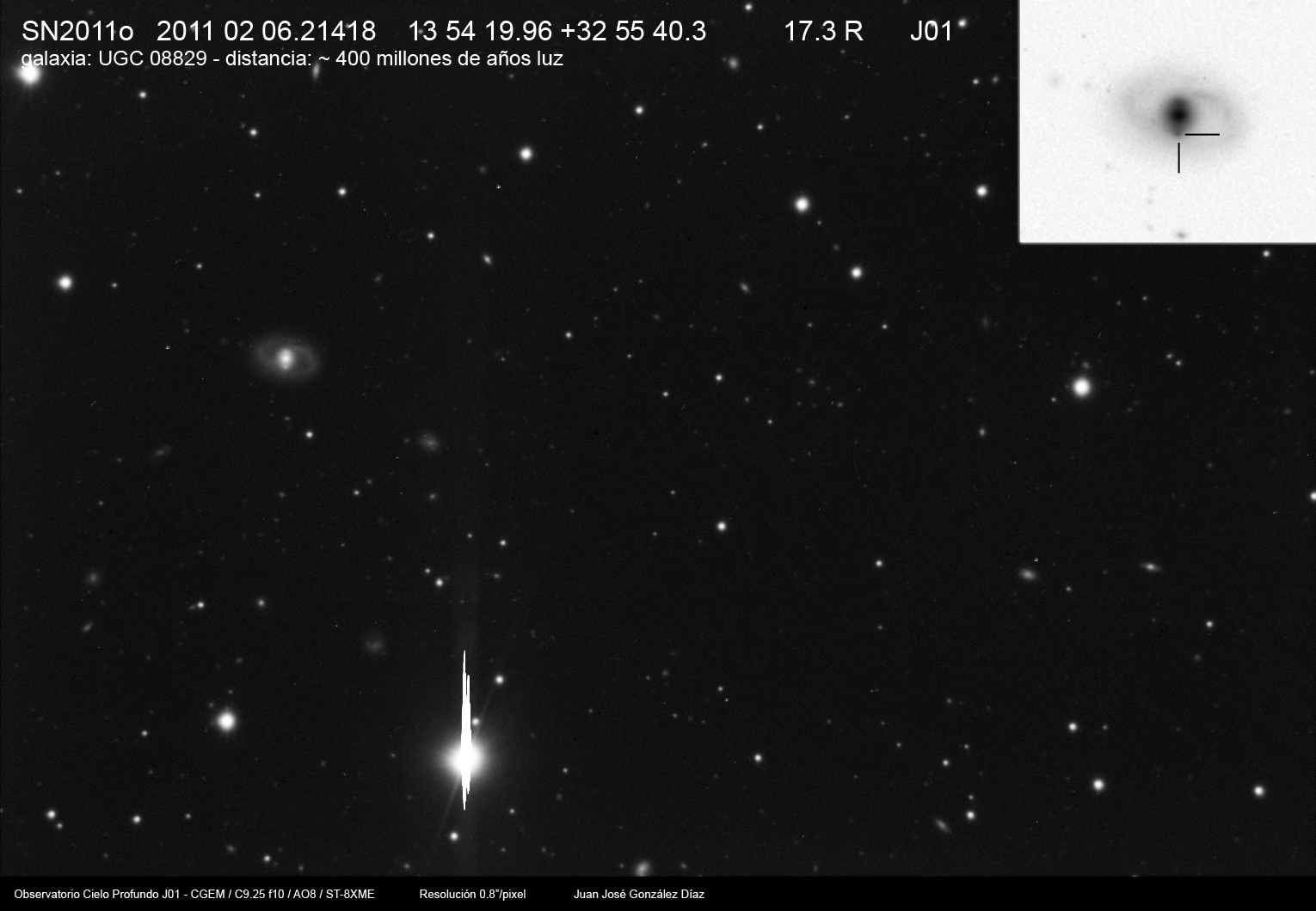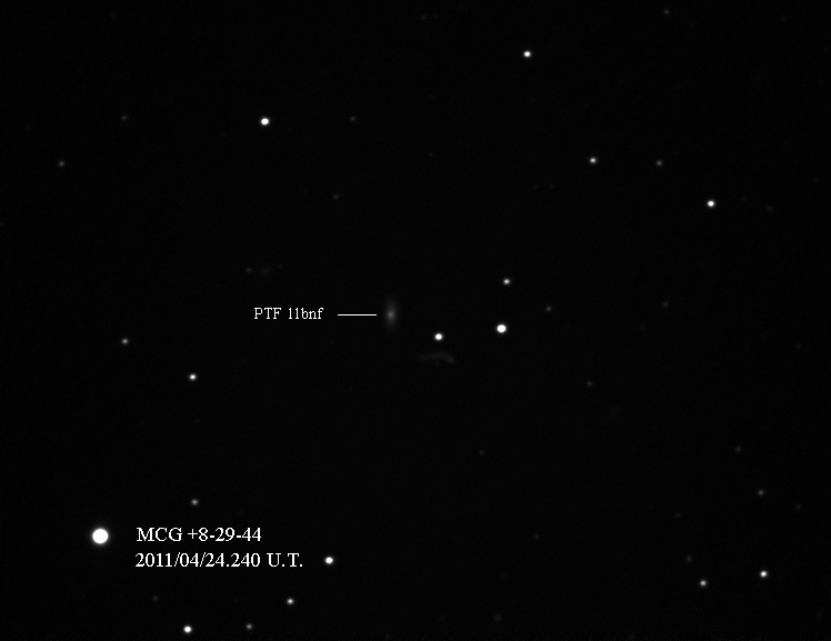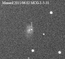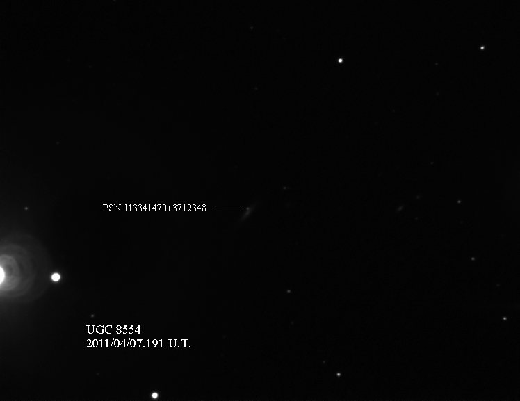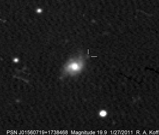 Found in MCG +5-4-59 at R.A. = 01h26m34s.68, Decl. = +31°37'03".5 (= PGC 5364) Located 14".2 east and 5".1 north of the center of MCG +5-4-59 (Discovery image) Mag 19.8:11/1 (17.9), Type II (References: CBAT TOCP ATEL 3633 SN PSN J01263180+3137026) 2011ix and 2011jj images sub-page  |
