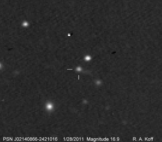 2011iq (= MASTER OT J024849.72-080430.3) (= CSS111030:024850-080430), CBET 2933 discovered 2011/10/29.36 by MASTER robotic Net at R.A. = 02h48m49s.60, Decl. = -08°04'30".0 Mag 18.3:10/29, Type Ia (Discovery image) (CSS image) (Joseph Brimacombe image) (Discovery image) (Joseph Brimacombe image) (CSS111030:024850-080430) (References: ATEL 3732, 3746)