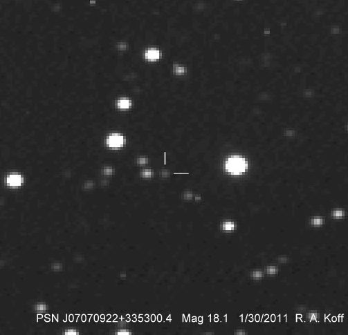 Found in PGC 2095477 at R.A. = 06h58m07s.67, Decl. = +37°13'11".6 Located 17" west and 6" north of the center of PGC 2095477 (Discovery image) (Robert Koff image) (Joseph Brimacombe image) (Leonid Elenin image) (F. Luppi and Luca Buzzi image) (Thomas Langhans image) (Thomas Langhans image) Mag > 20.1 (18.7:11/18), Type Ia (References: CBAT TOCP)  |