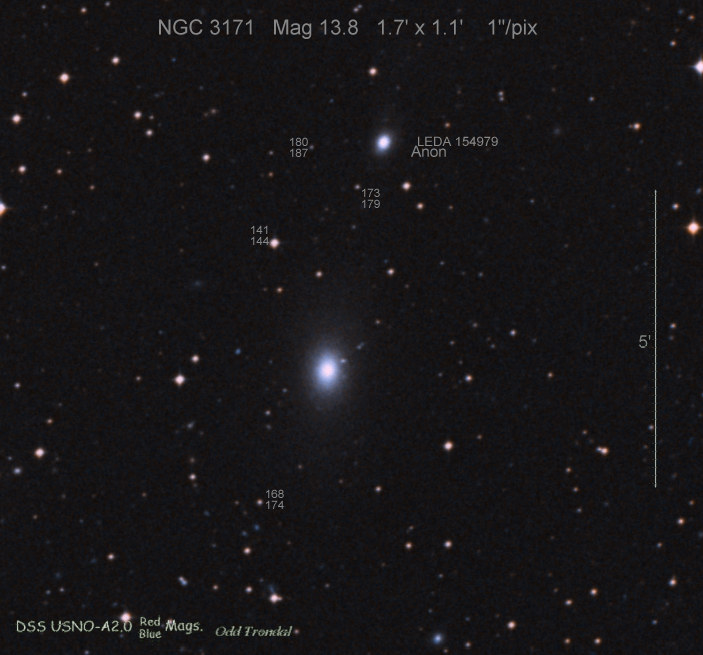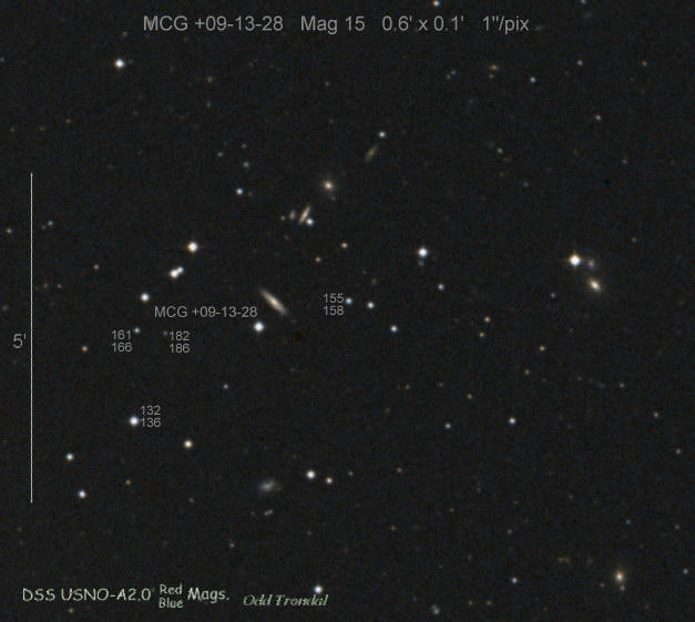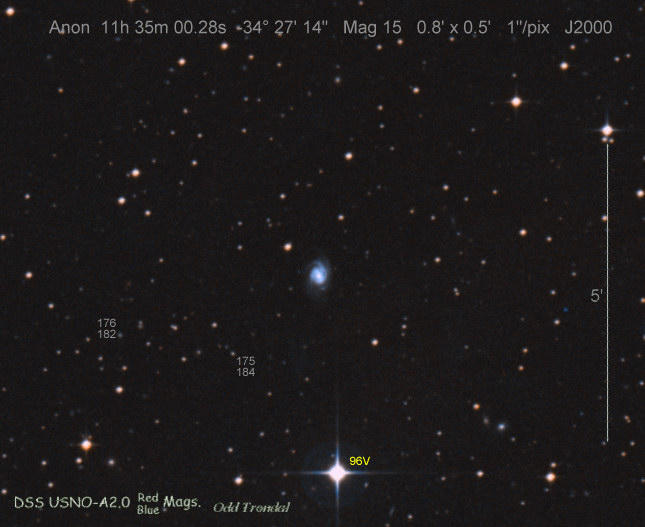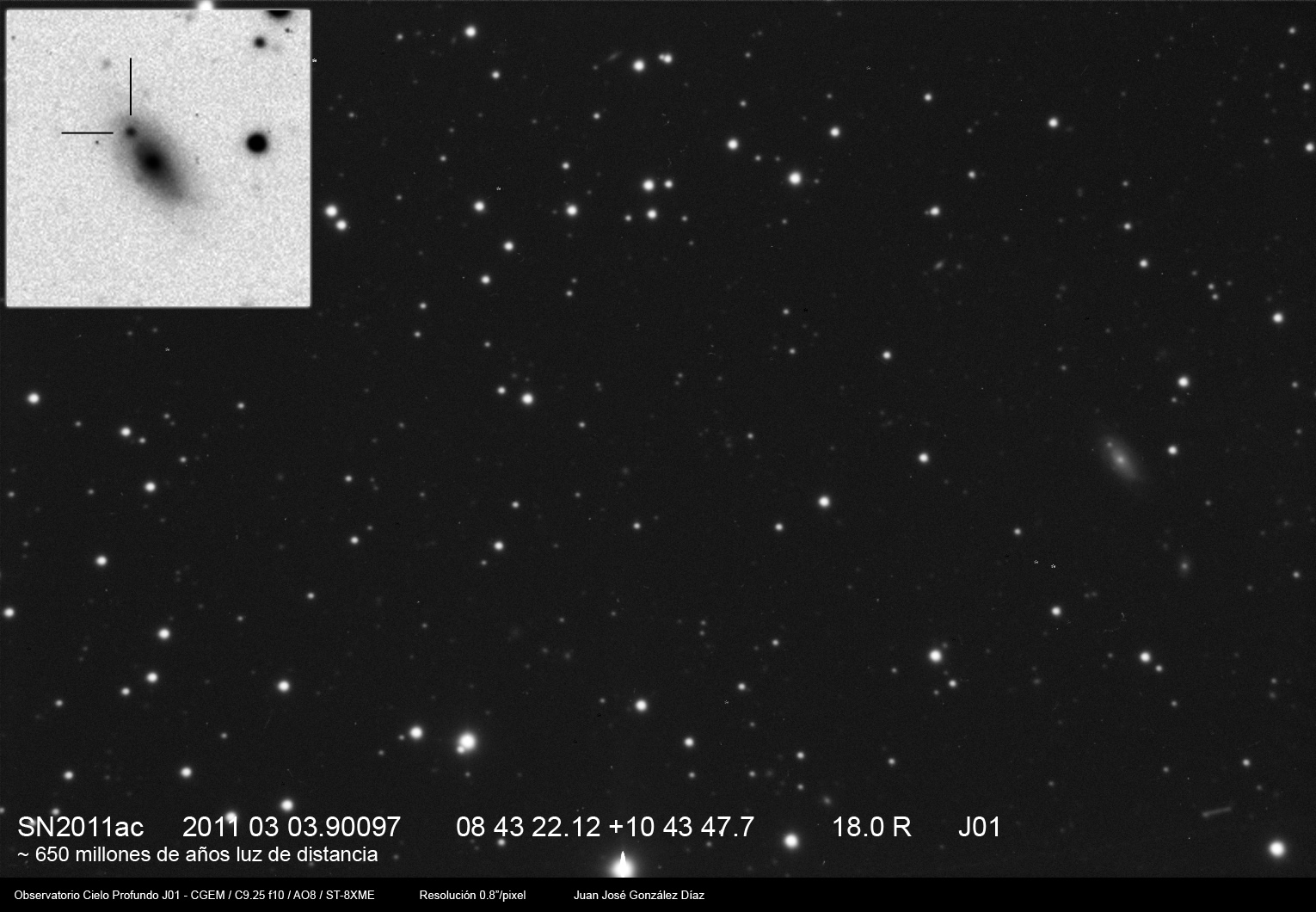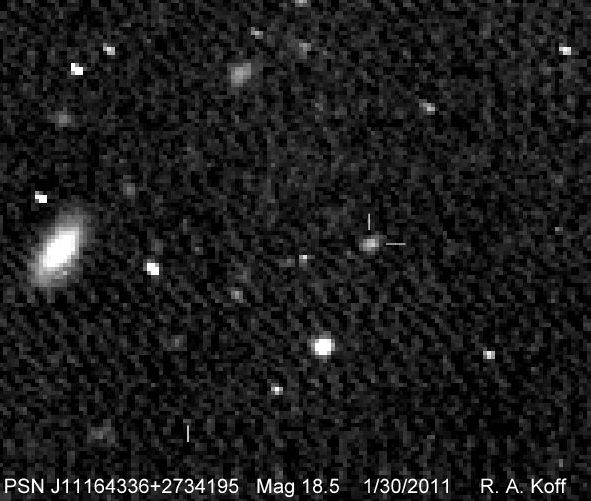 Found in an anonymous galaxy at R.A. = 10h50m44s.20, Decl. = +28°00'49".0 Located 0" east and 1" north of the center of the host galaxy (Discovery image) (Joseph Brimacombe image) Mag 18.8, Type Ia  |