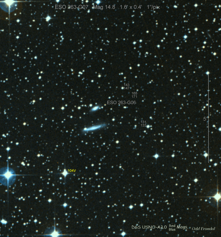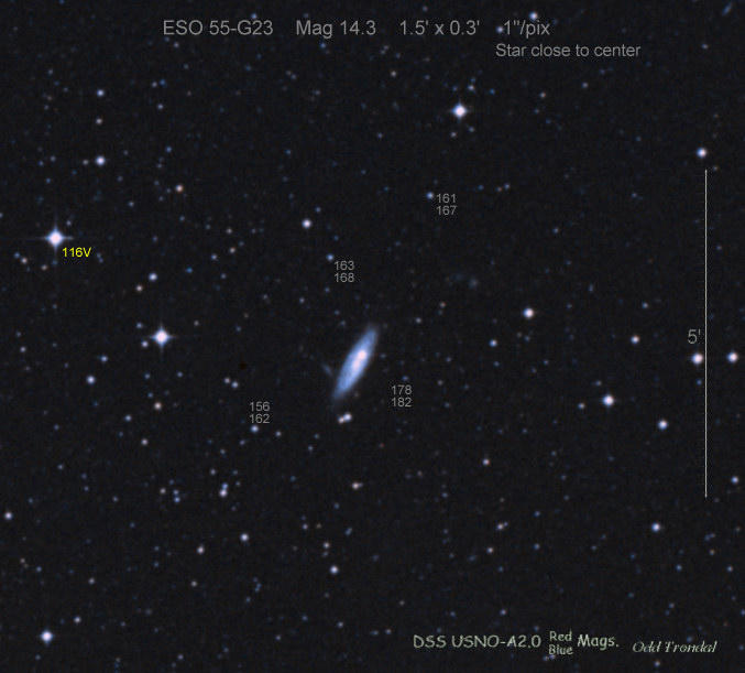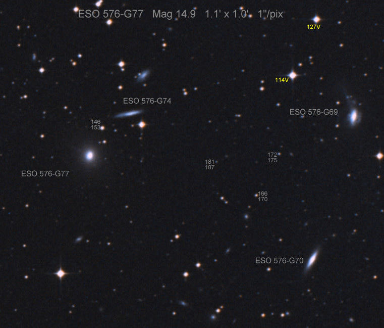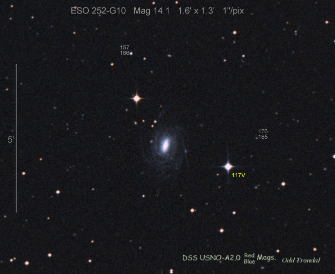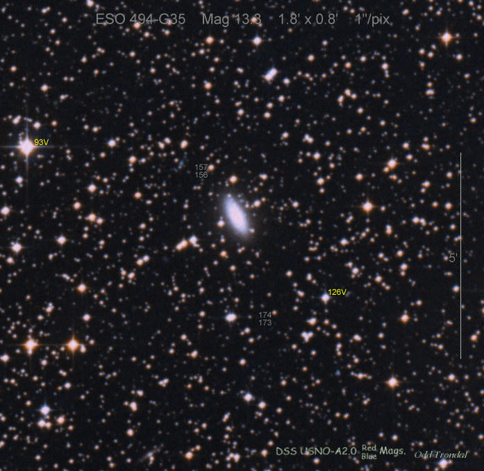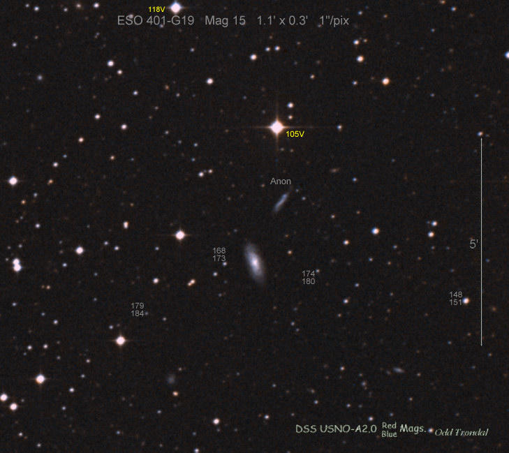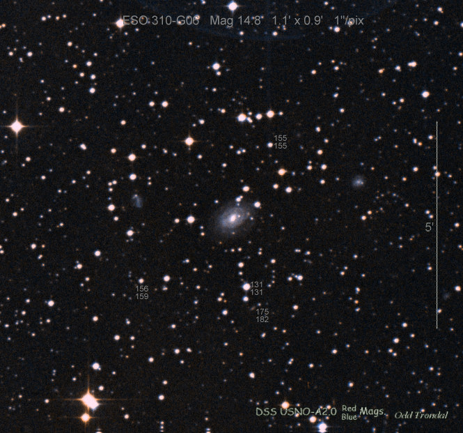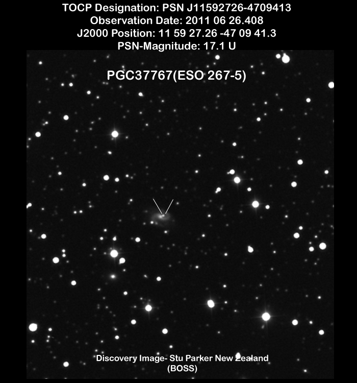 Found in ESO 310-6 at R.A. = 07h16m34s.08, Decl. = -38°29'03".7 Located 12" west and 11" north of the center of ESO 310-6 (Discovery image (Discovery page)) (Joseph Brimacombe image) Mag 16.8:11/23, Type Ib (References: CBAT TOCP)  |