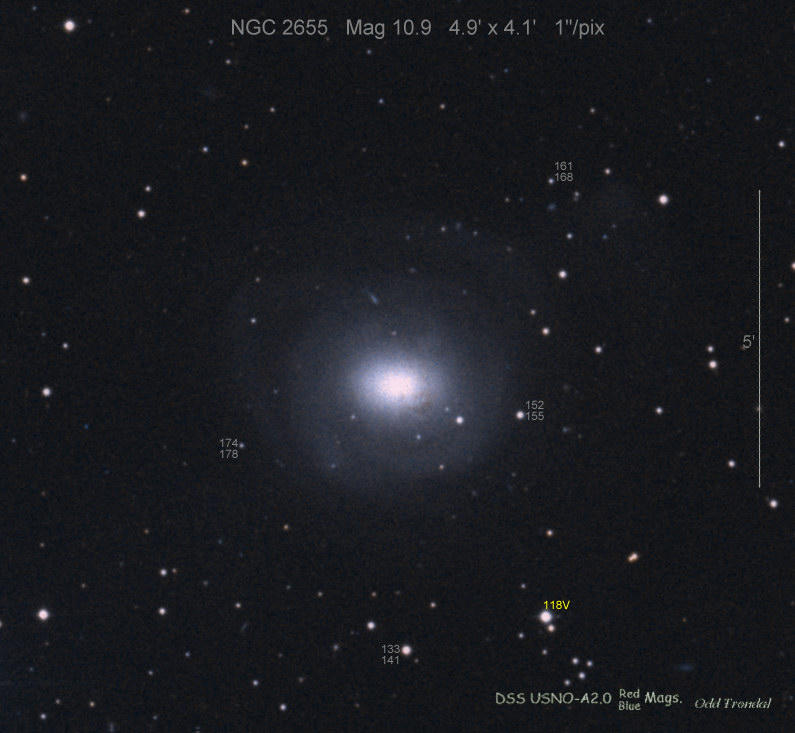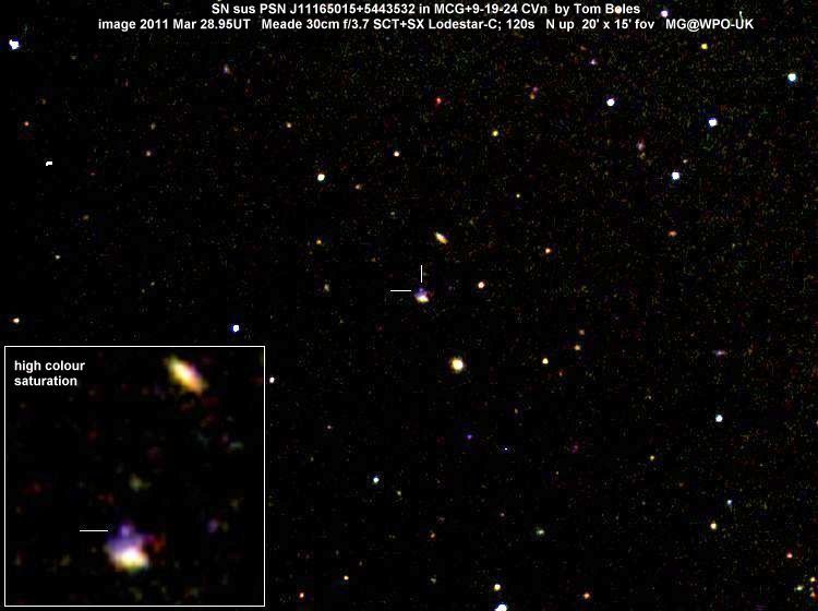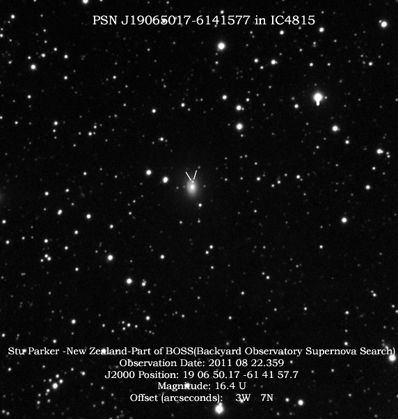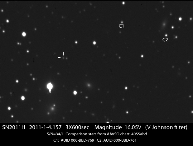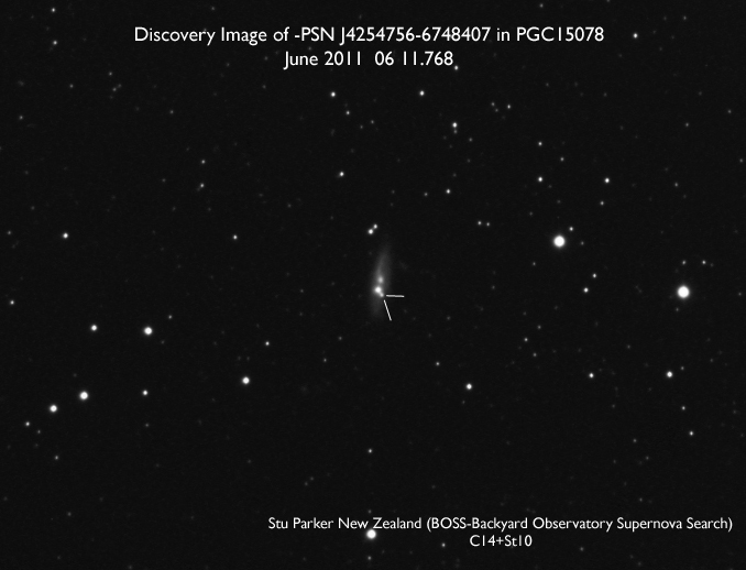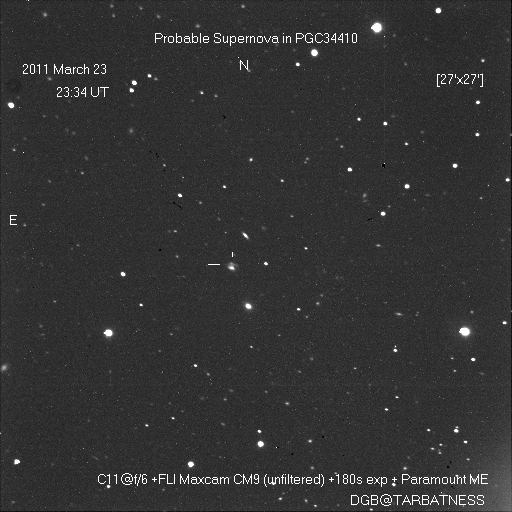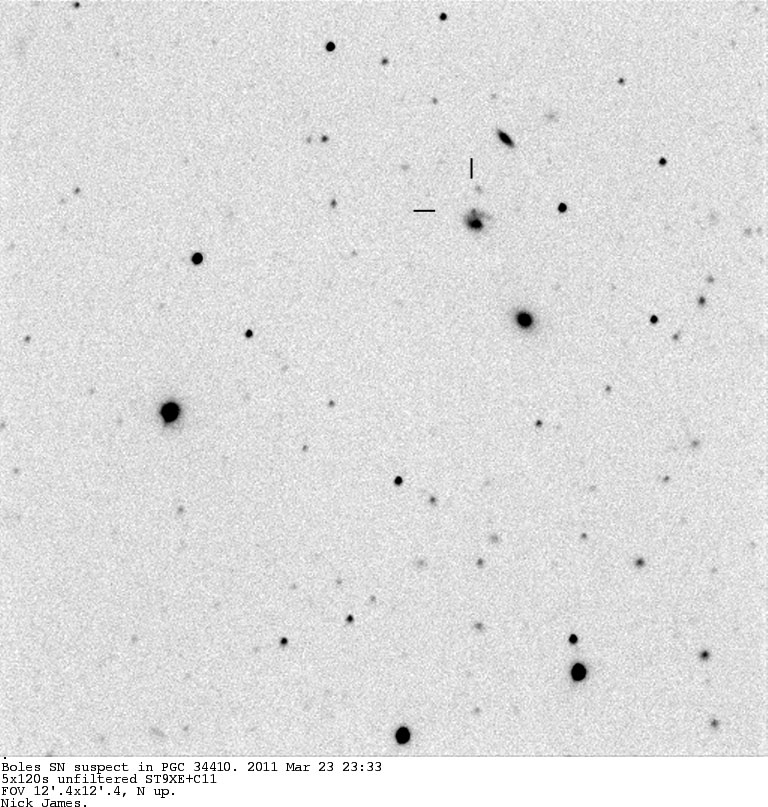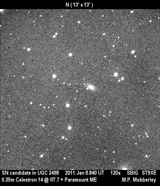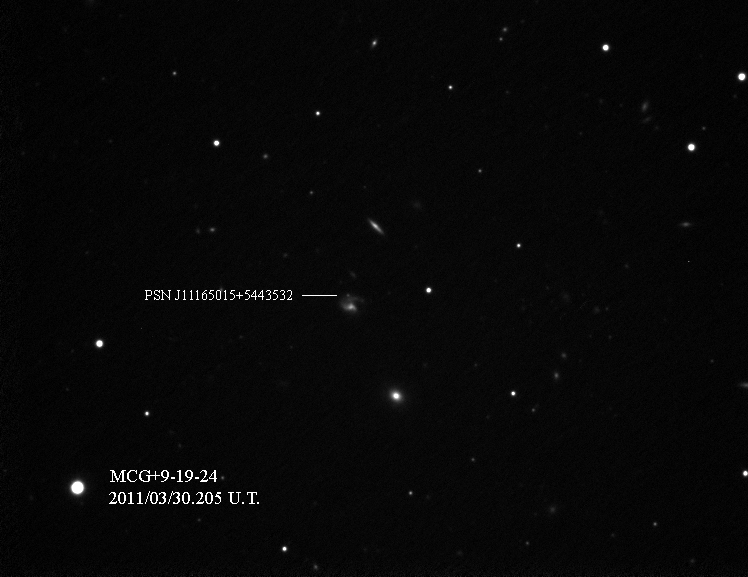 Found in NGC 2655 at at R.A. = 08h55m48s.50, Decl. = +78°13'02".7 Located 31".7 east and 21".4 south of the nucleus of NGC 2655 (Itagaki discovery image) (Tsuboi discovery image) Mag 21.3:12/28 (12.8:1/23), Type Ia (References: ATEL 3395) 2011B images sub-page  |