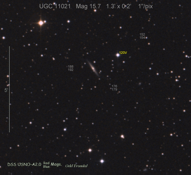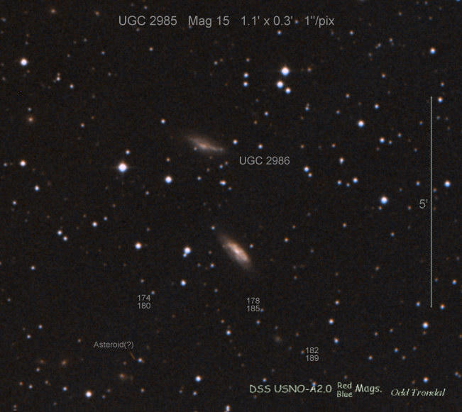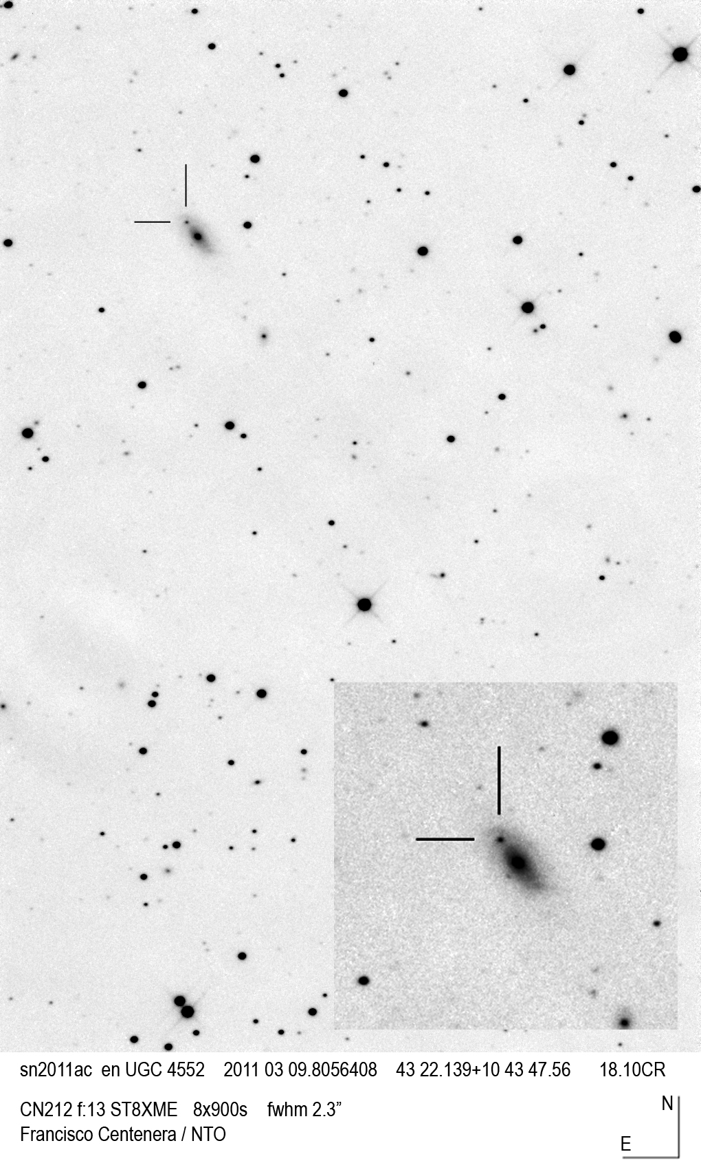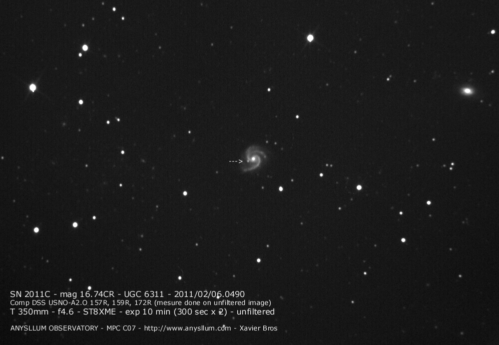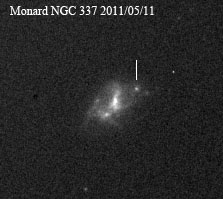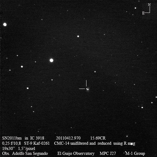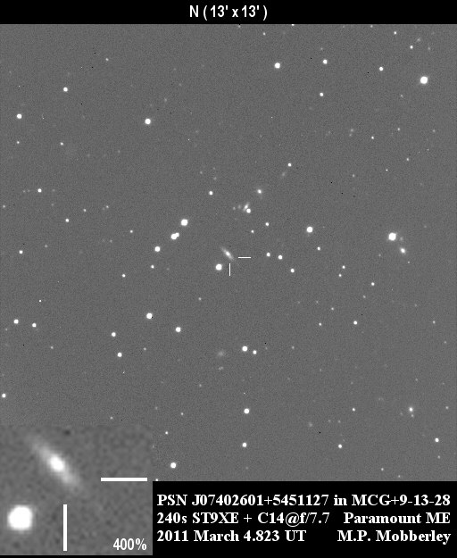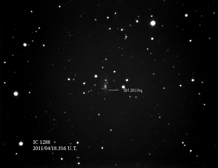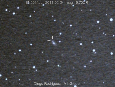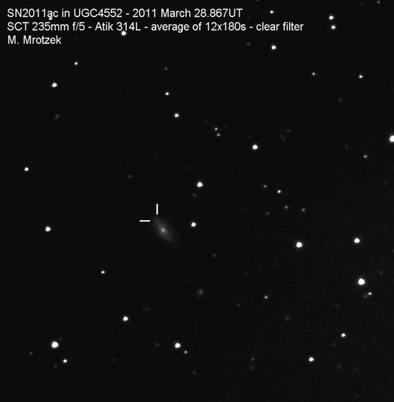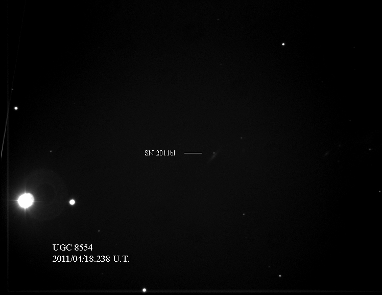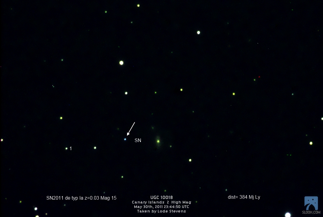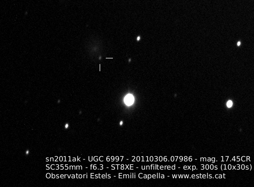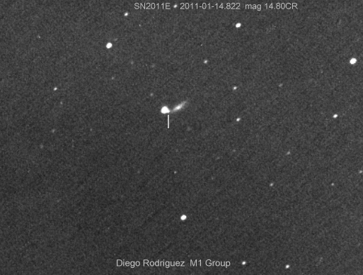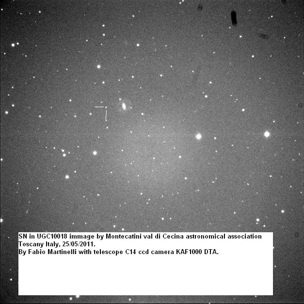 Found in UGC 2985 at R.A. = 04h13m33s.93, Decl. = +27°32'36".7 Located 5".2 east and 6".7 north of the center of UGC 2985 (Discovery image) Mag 17.9** (15.9), Type Ia (References: CBET 2651) 2011U images sub-page  |