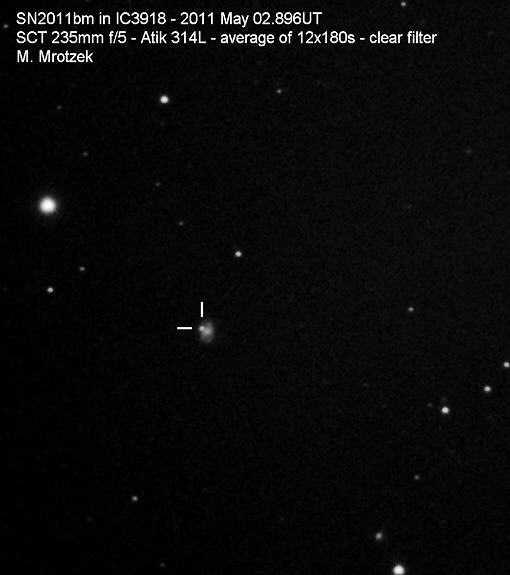 Found in UGC 3218 at R.A. = 05h00m41s.55, Decl. = +62°14'38".6 Located 14".6 west and 0".6 south of the center of UGC 3218 (Discovery image) Mag 18.3* (16.1), Type Ia (References: SN 2006le) 2011M images sub-page  |