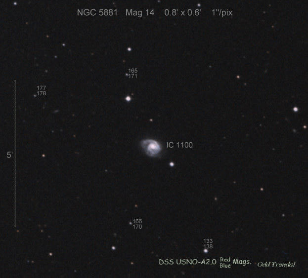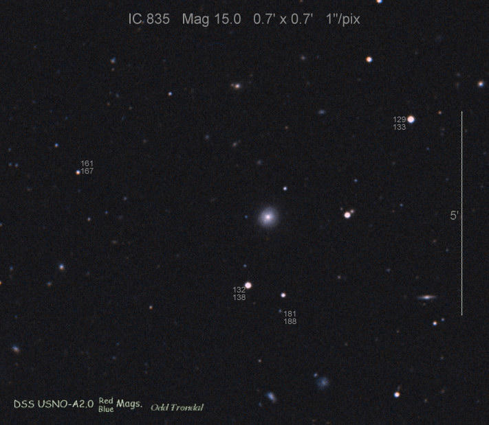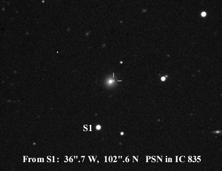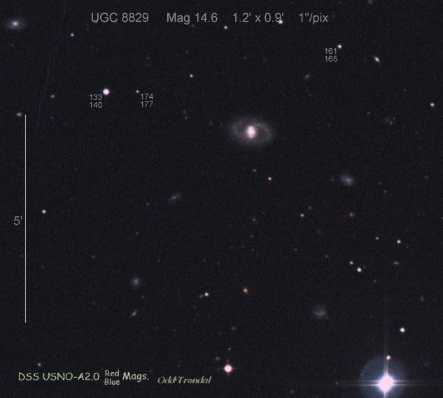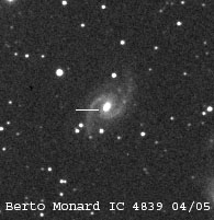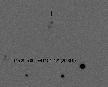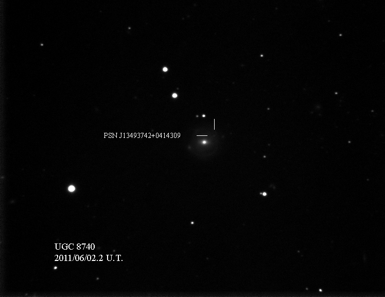 Found in UGC 8829 at R.A. = 13h54m19s.95, Decl. = +32°55'39".4 Located 0".8 east and 8".5 south of the center of UGC 8829 (Discovery image) (Joseph Brimacombe image) (Juanjo Gonzalez image) Mag 17.3**, Type II  |