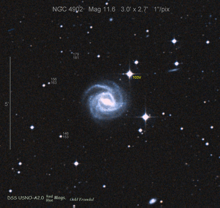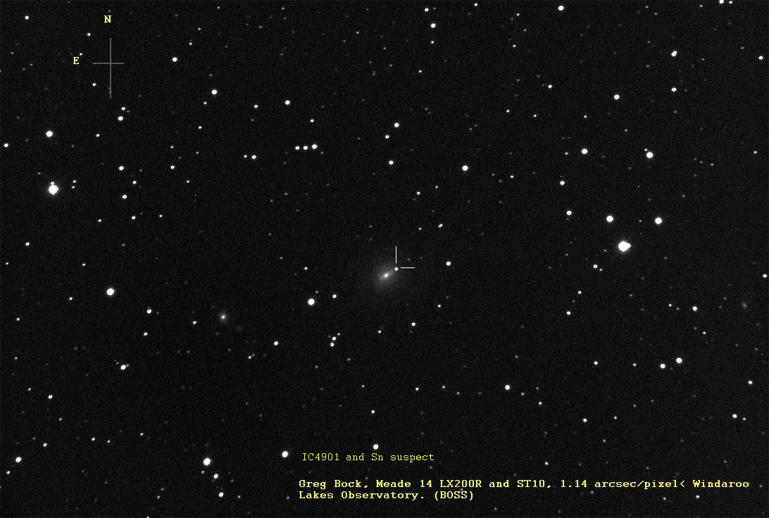 Found in NGC 4902 at R.A. = 13h01m01s.19, Decl. = -14°31'34".8 Located 21".3 east and 46".5 south of the center of NGC 4902 (Discovery image (Discovery page)) (Joseph Brimacombe image) (Juanjo González image) Mag 17.9, Type IIn (References: SN 1991X, 1979E)  |