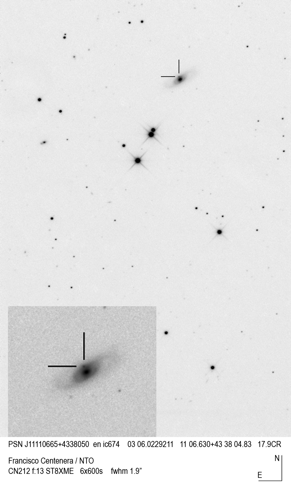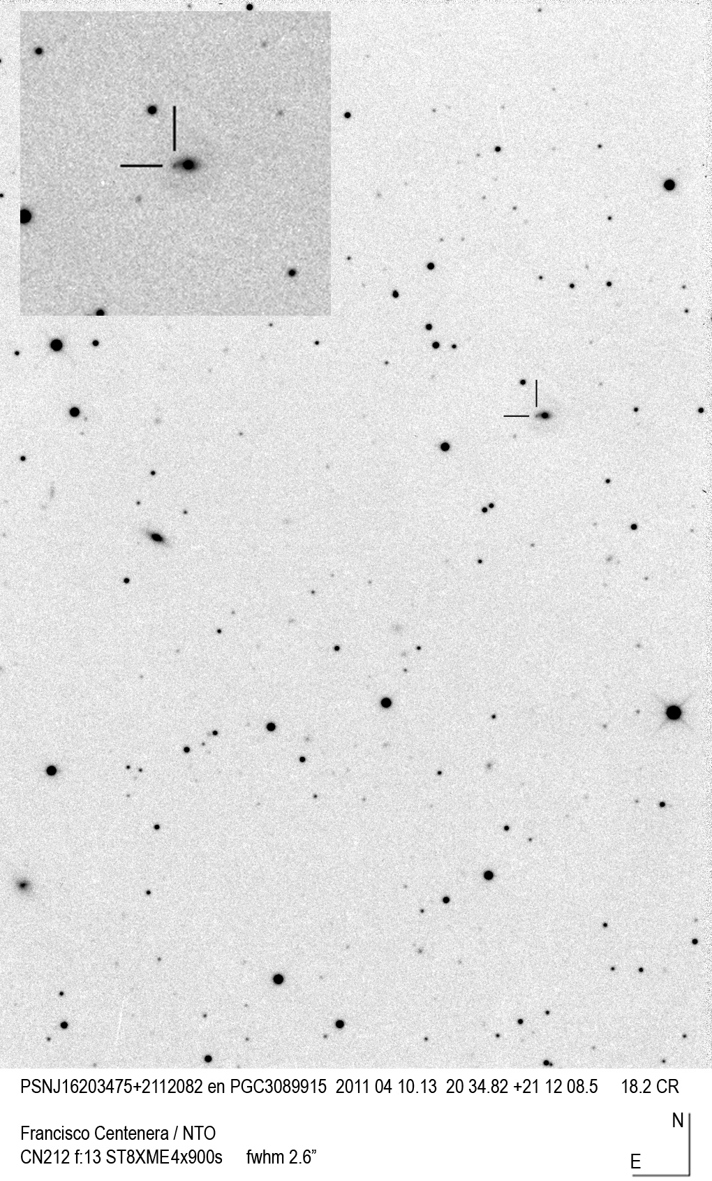 Found in UGC 1774 at R.A. = 02h18m27s.81, Decl. = +05°33'16".5 Located 7".1 east and 3".4 north of the center of UGC 1774 (Discovery image) (Joseph Brimacombe image) (Giancarlo Cortini image) Mag 18.4:11/21, Type II (References: CBAT TOCP)  |