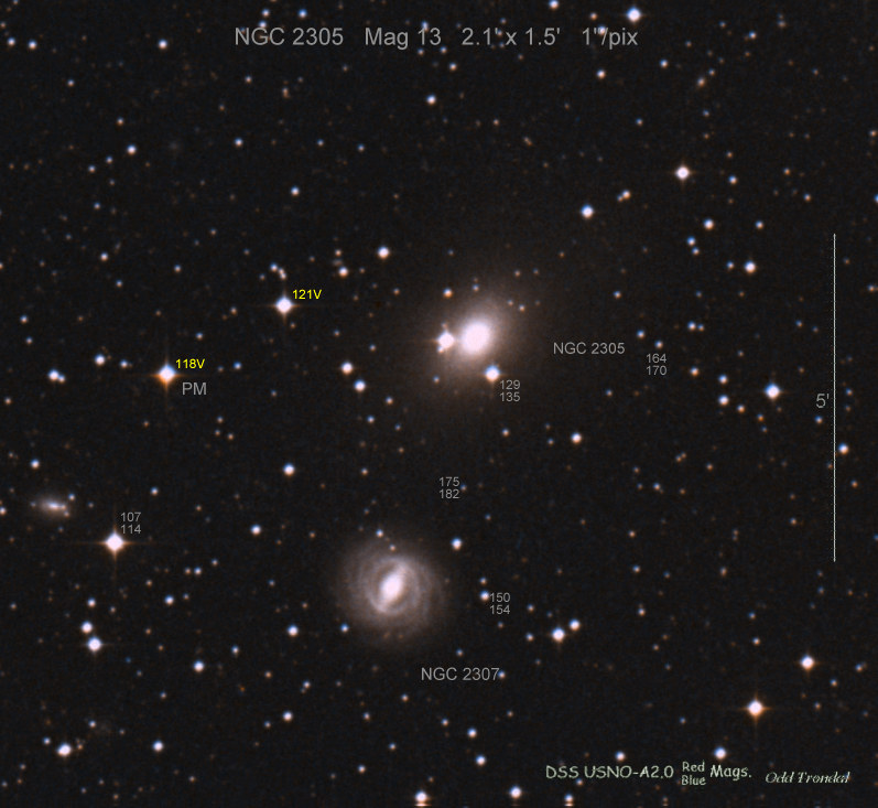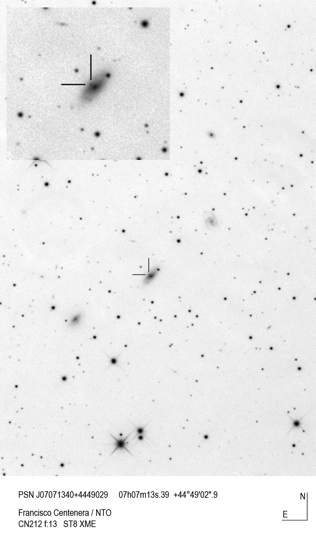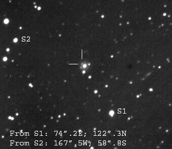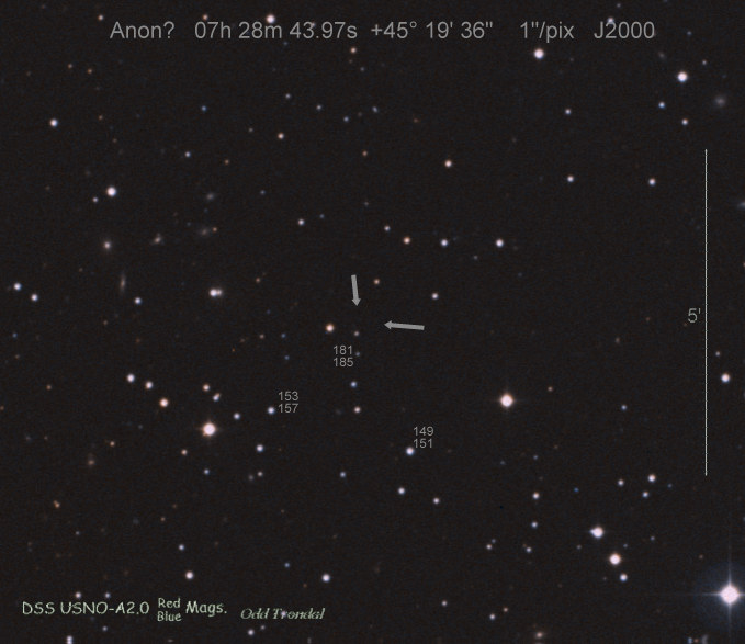 Found in an anonymous galaxy at R.A. = 07h28m43s.97, Decl. = +45°19'36".5 Located 0" west and 0" north of the center of the host galaxy (Discovery image) (Joseph Brimacombe image unconfirmed) Mag 17.3:11/7, Type unknown  |
