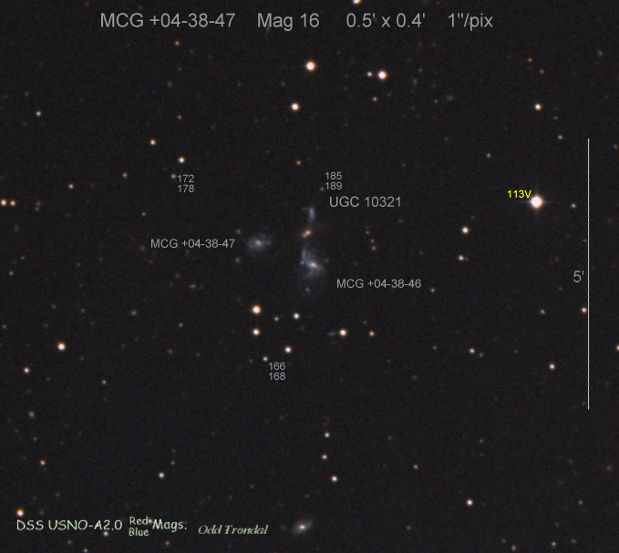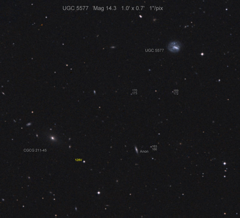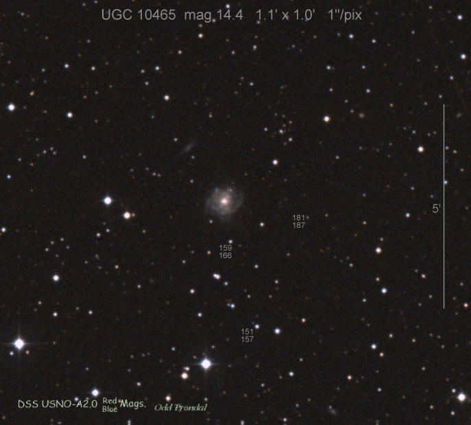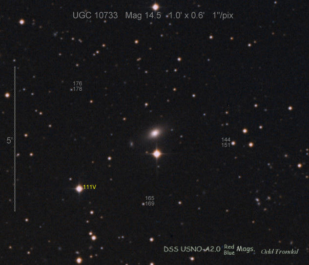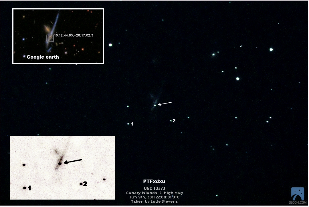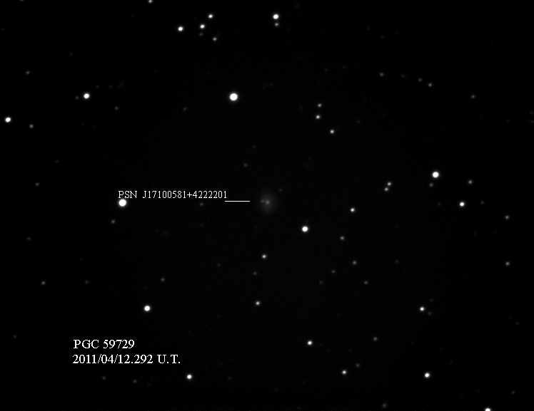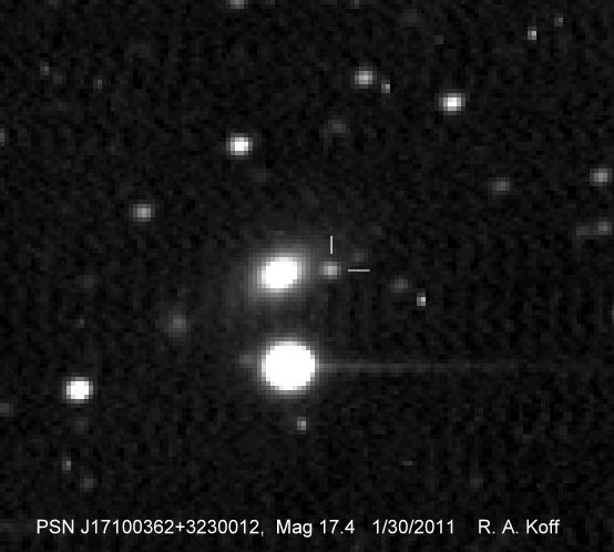 Found in UGC 10733 at R.A. = 17h10m03s.61, Decl. = +32°30'01".2 Located 23" west and 1" north of the center of UGC 10733 (Robert Koff image) (Joseph Brimacombe image) (Lode Stevens image) (Juanjo González image) (Enrico Prosperi image) Mag > 19.0* (16.3), Type Ia  |