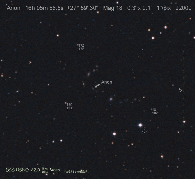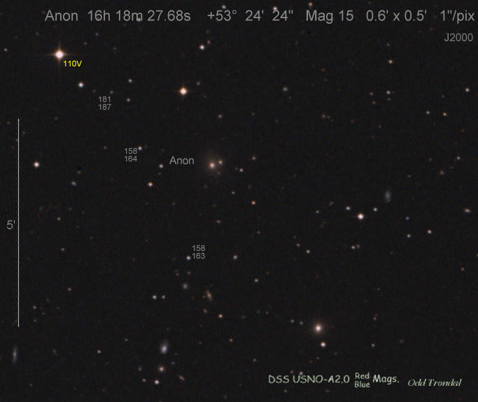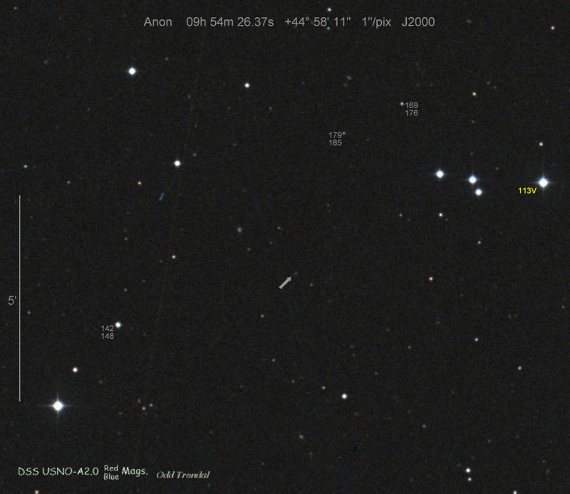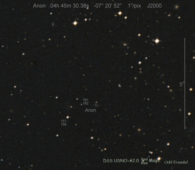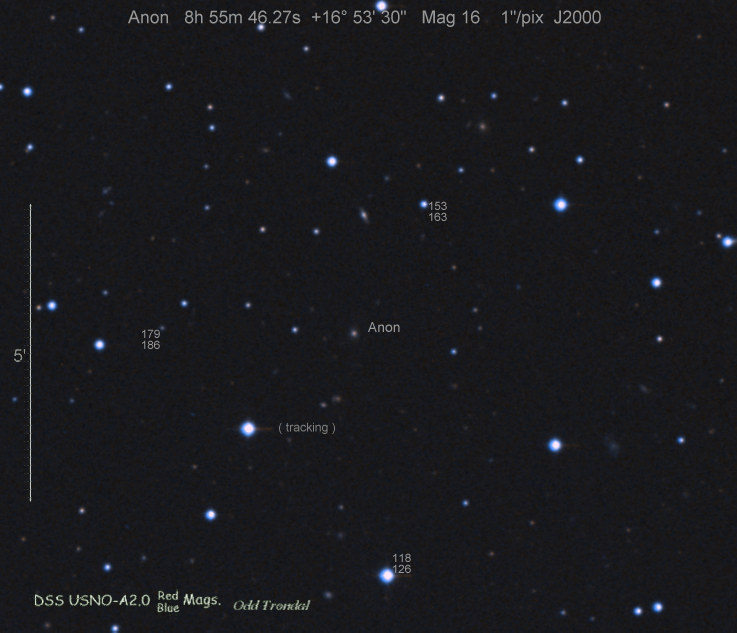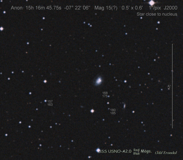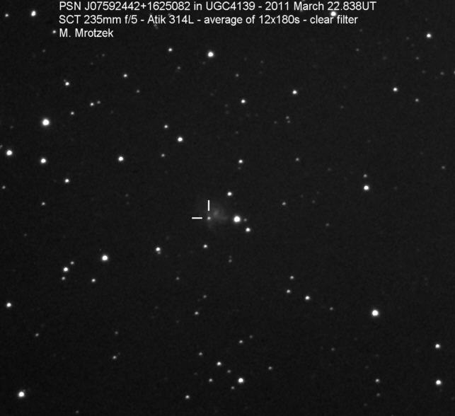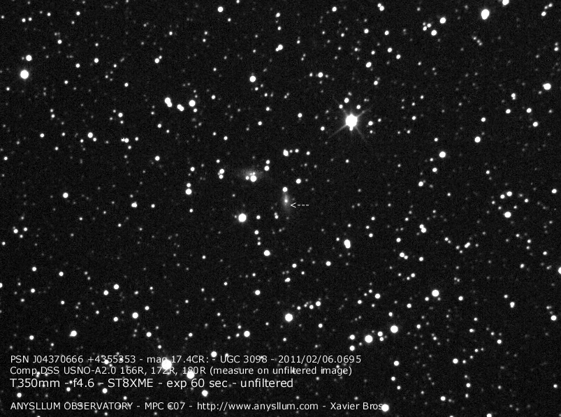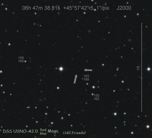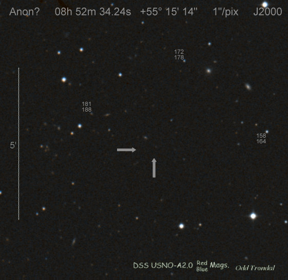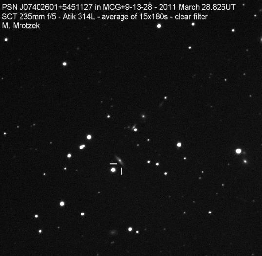 Found in an anonymous galaxy at R.A. = 06h47m38s.81, Decl. = +45°57'42".5 Located 0" west and 0" north of the center of the anonymous galaxy (Discovery image) (Joseph Brimacombe image) (Thomas Langhans image) Mag > 20.2 (15.2:11/4), Type unknown  |
