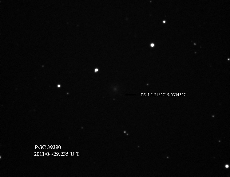 Found in UGC 6311 at R.A. = 11h17m54s.88, Decl. = -02°05'45".2 Located 1".4 west and 14".4 south of the center of UGC 6311 (Discovery image (Discovery page)) (Joseph Brimacombe image (wide field)) (Ivan Curtis image) (JM Llapasset image) (CRTS image) (Xavier Bros image) (Rafael Benavides image) (Juanjo González image) (Enrico Prosperi image) Mag > 19.0, Type Ia  |