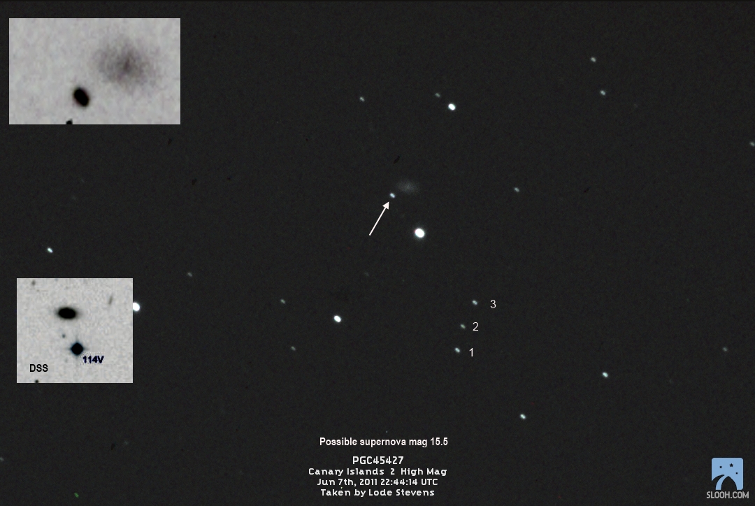 Found in an anonymous galaxy at R.A. = 23h34m48s.20, Decl. = +24°45'01".6 Located 0" east and 0" north of the center of the anonymous galaxy (Discovery image) (Joseph Brimacombe image) (JM Llapasset image) (William Wiethoff image) Mag 17.1:12/7 (16.9:11/29), Type IIn (References: ATEL 3795)  |