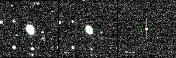 Found in anonymous galaxy at R.A. = 04h45m30s.38, Decl. = -07°20'52".7 Located 0" east and 2" south of the center of the host galaxy (Discovery image) Mag 16.9** (14.8), Type Ia 2011K images sub-page  |
