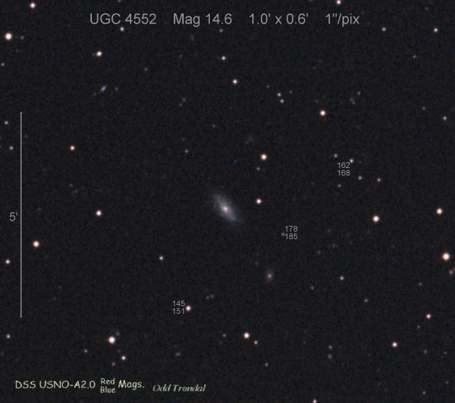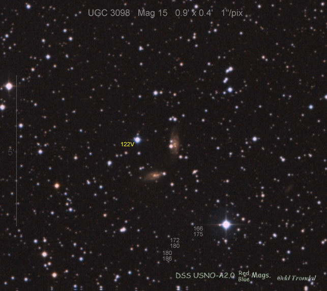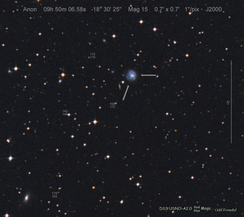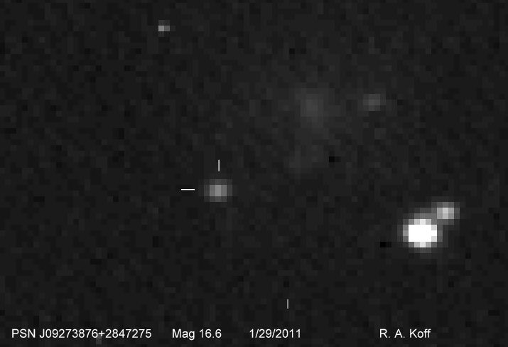 Found in UGC 5040 at R.A. = 09h27m38s.75, Decl. = +28°47'27".5 (= MCG +05-22-48) Located 35" east and 27" south of the center of UGC 5040 (Discovery image) (Robert Koff image) (Manfred Mrotzek image) (Joseph Brimacombe image) (Marc Serrau image) (Joel Nicolas image) (Marc Serrau image) (JM Llapasset image) (Joel Nicolas image) (Joel Nicolas image) (Rafael Benavides image) (Juanjo González image) (Enrico Prosperi image) (Marc Serrau image) Mag 17.3**, Type IIb  |