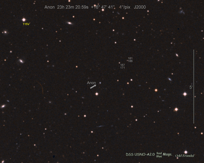 Found in an anonymous galaxy at R.A. = 22h56m14s.60, Decl. = +38°08'15".3 Located 0" west and 0" north of the center of the anonymous galaxy (Discovery image) (Joseph Brimacombe image unconfirmed) (William Wiethoff image) Mag 17.2:11/4, Type unknown  |
