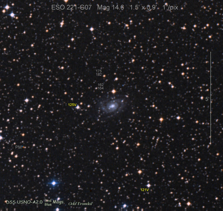 Found in ESO 221-G7 at R.A. = 13h50m21s.36, Decl. = -52°39'58".5 Located 63" west and 20" south of the center of ESO 221-G7 (Discovery image (Discovery page)) (Joseph Brimacombe image) (Joseph Brimacombe image) Mag > 20 (17.3), Type IIP (References: (CBET 2652 corrected))  |