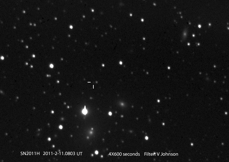 For the year 2011, 957 supernovae (557 last year) 288 of these supernovae were named by CBAT, 92 were given possible supernova designations, and 505 were not reported to CBAT. 96 supernovae were found in NGC/IC galaxies, 256 were found in named galaxies. The brightest SN of the year are 2011fe (Mag 9.9), 2011ja (Mag 11.7), 2011dh (Mag 12.1), 2011iv (Mag 12.1), 2011iy (Mag 12.2), 2011by (Mag 12.5), 2011B (Mag 12.8), followed by 2011ae (Mag 13.0), 2011ao (Mag 13.9), and 2011aa (Mag 13.9).