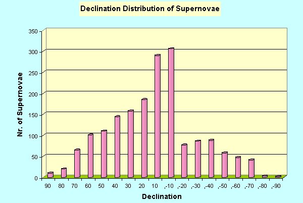 This graph shows the distribution of SNe according to the declination of their parent galaxies. Four Intergalactic Supernovae are not considered as it's impossible to establish a correct declination.