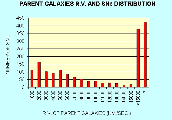 This graph shows the distribution of SNe according to the recession velocity of their parent galaxies.
