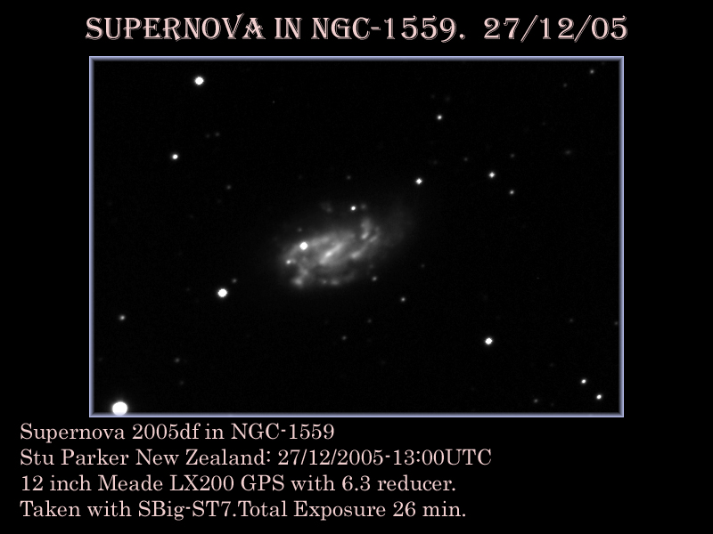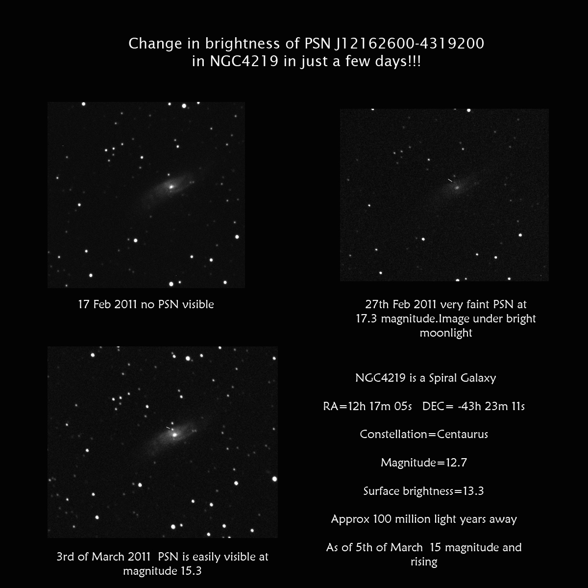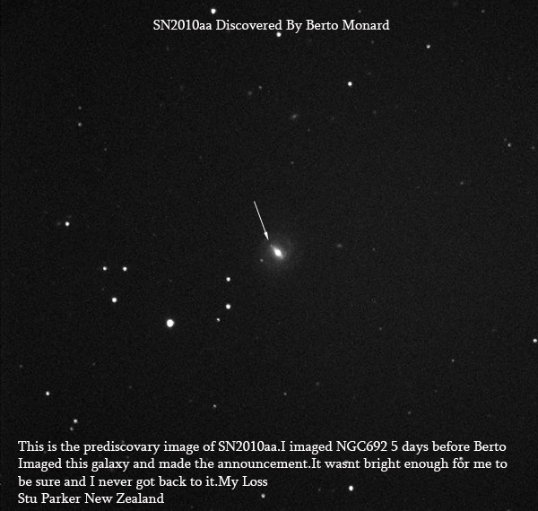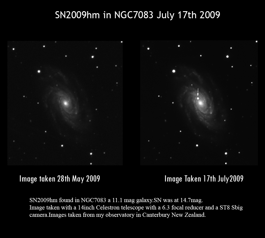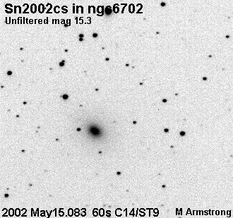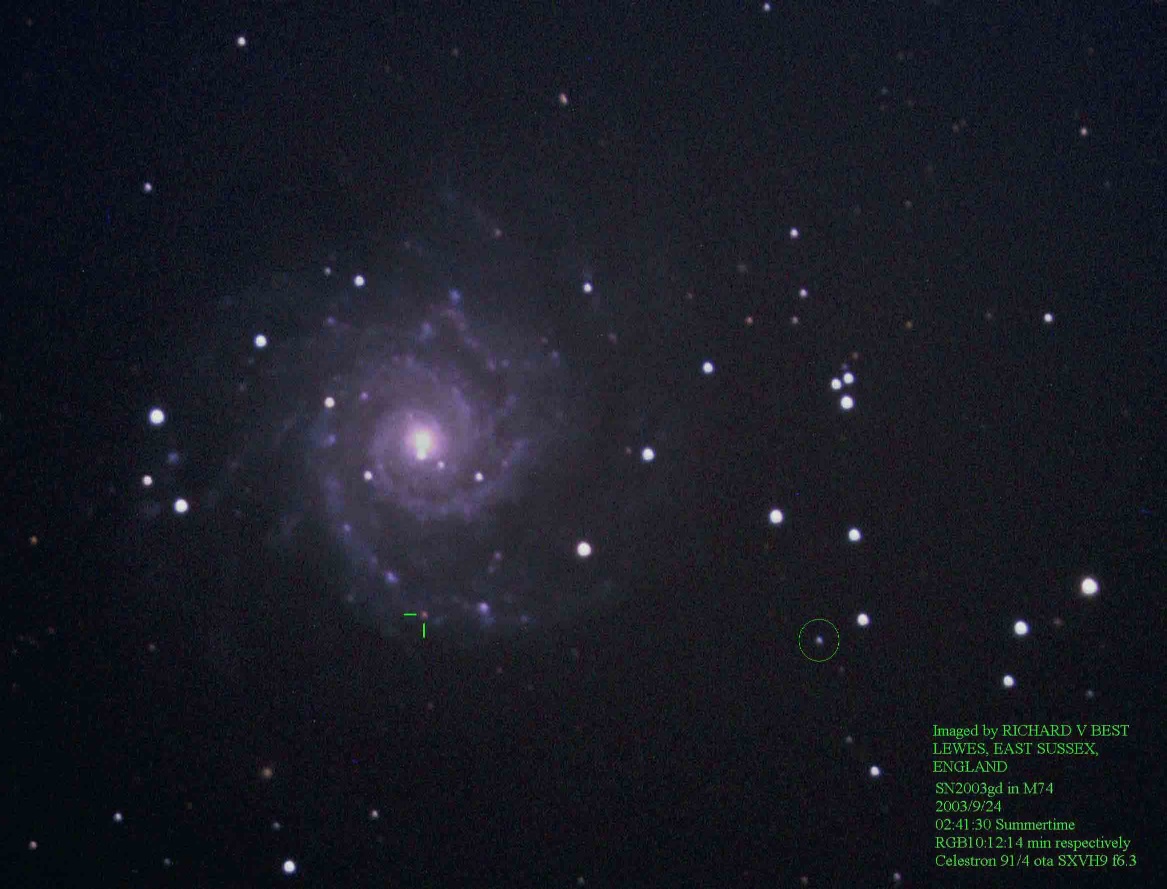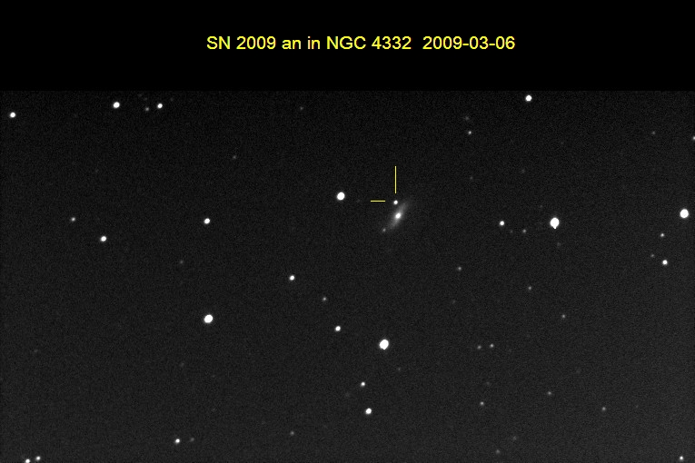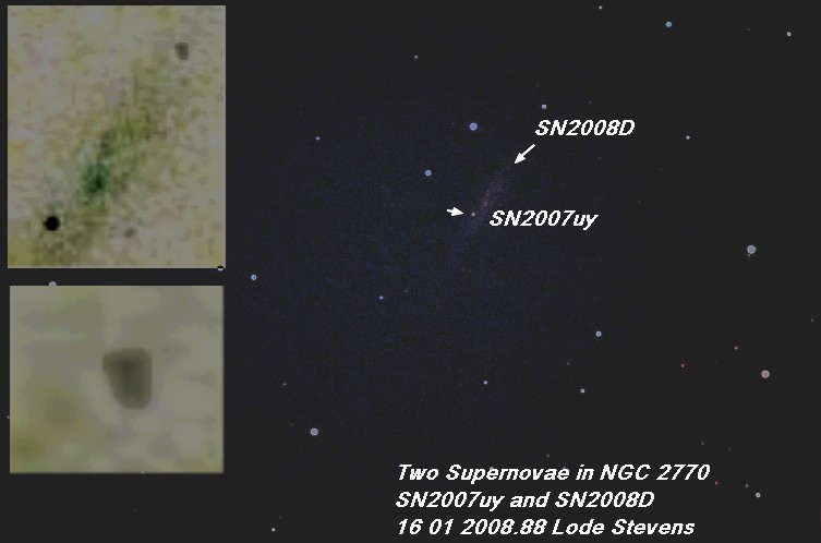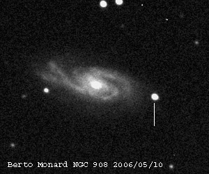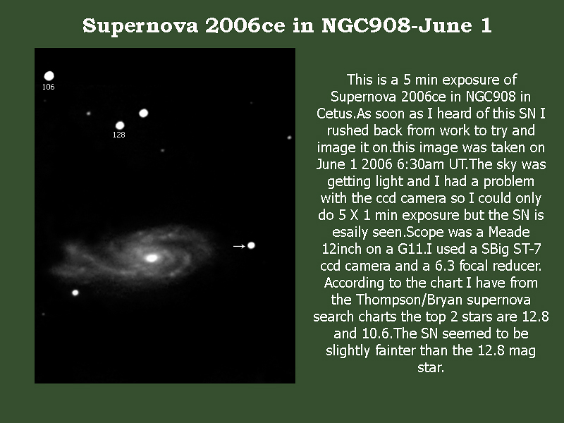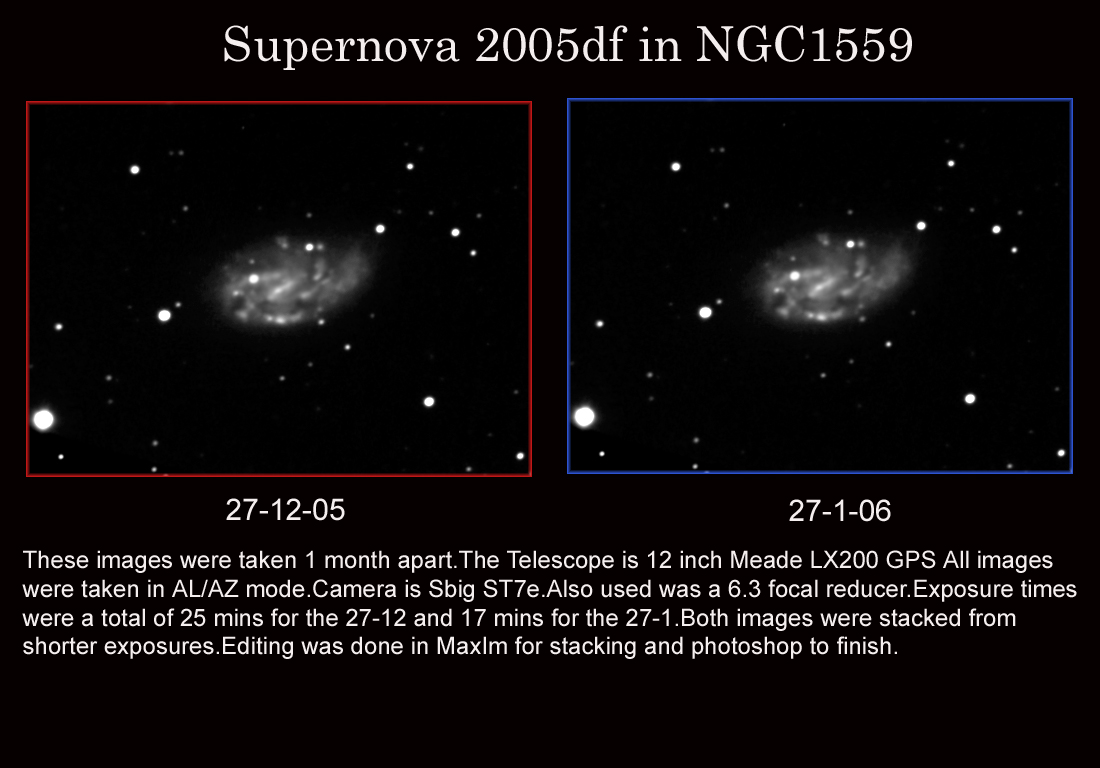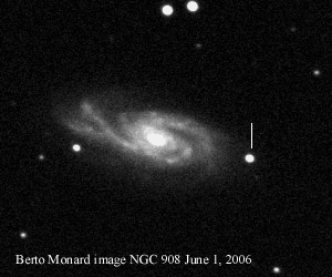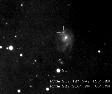 On this web page you will find a list of all the images that have been e-mailed to me for the Bright Supernovae webpages. If an image already exist on a web site, I will usually just create a link to it. However for people who do not have web sites I will accept images which I will then publish on my pages (which I sometimes crop). It should be noted that these images were given to me for use on the web page with the understanding that the copyright remains with the person who originally took them. My thanks to all of the people who donated images. For a list of the best SN images I have found out on the net, please check my Best SN images on the net page.