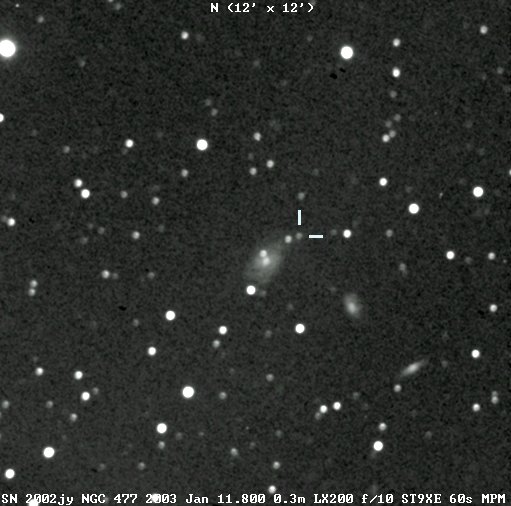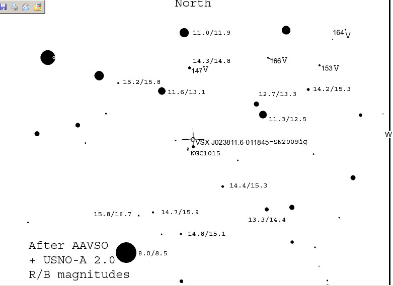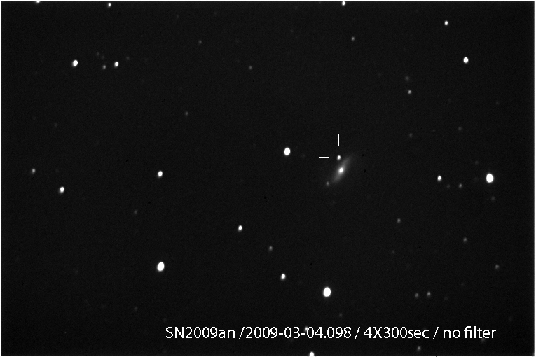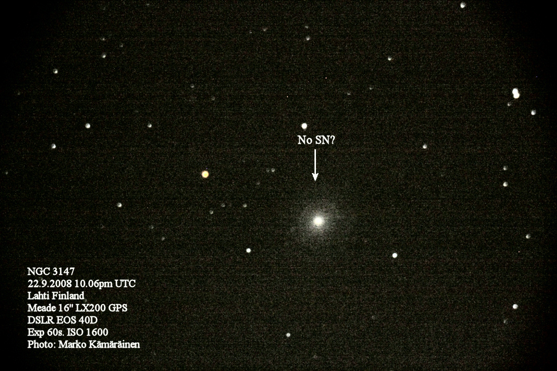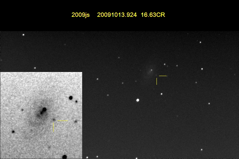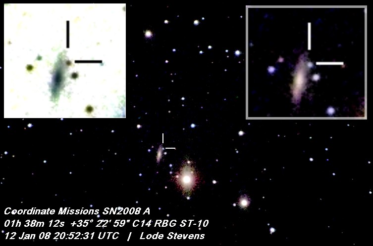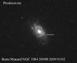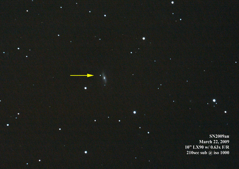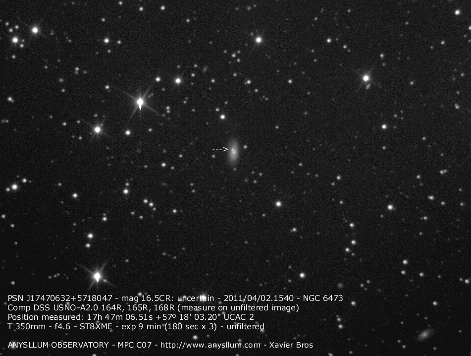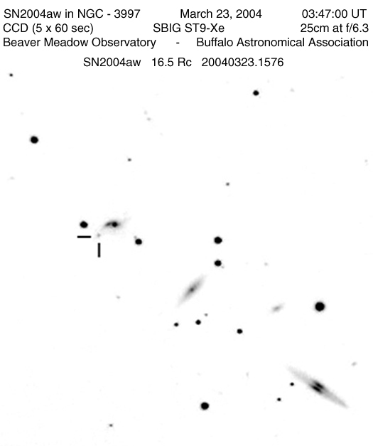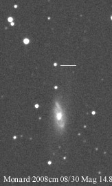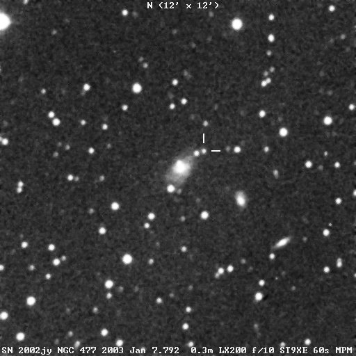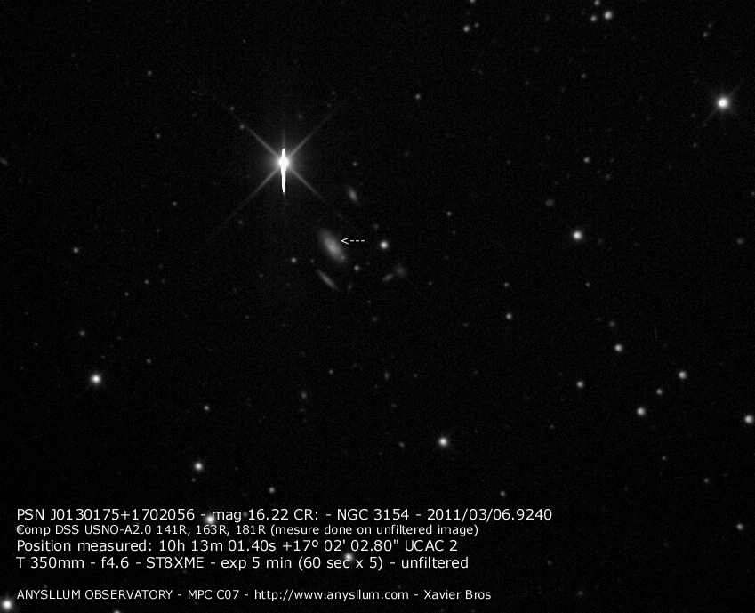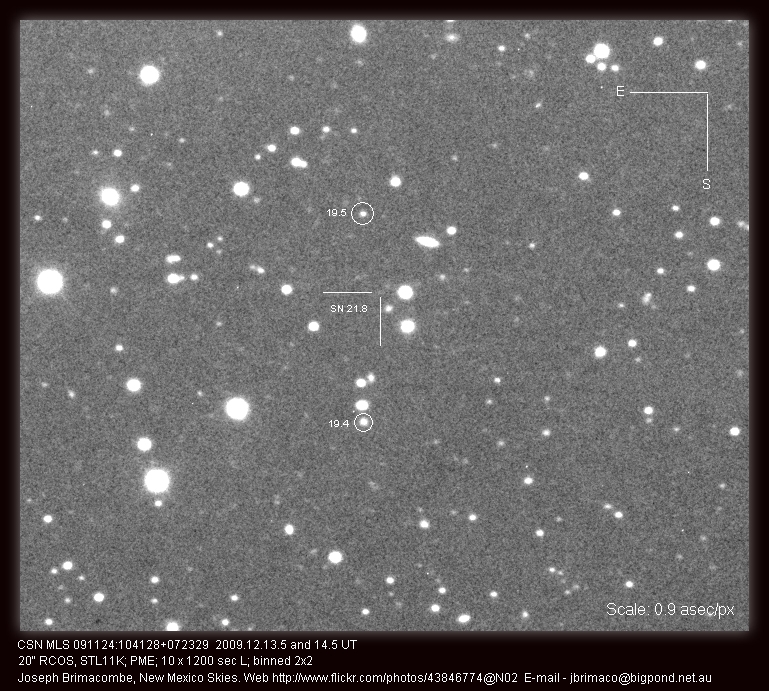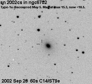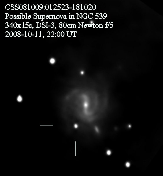 Image naming conventions: Normally I name them after the galaxy they are in, like n3080s1.jpg would read as "NGC 3080 supernova image 1". That carries to the odder galaxy names. If CBET does not give me a name, then I use the first one that comes up in NED. Oddly many of the PGC galaxy names I see in wikisky are not in NED (which is supposed to have all of them). If the galaxy does not have a name, then I named it after the SN name, sn09df2.jpg as "supernova 2009df image 2". For these CSS (and other survey) galaxies, I don't have that name, so I went to this convention: a1447p0958s1.jpg as "anonymous galaxy at 14:47 +09d58 supernova image 1".
