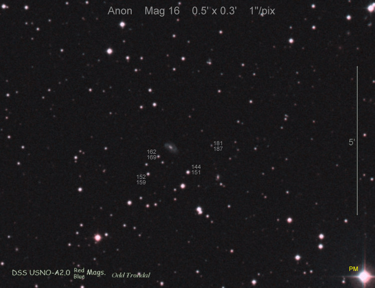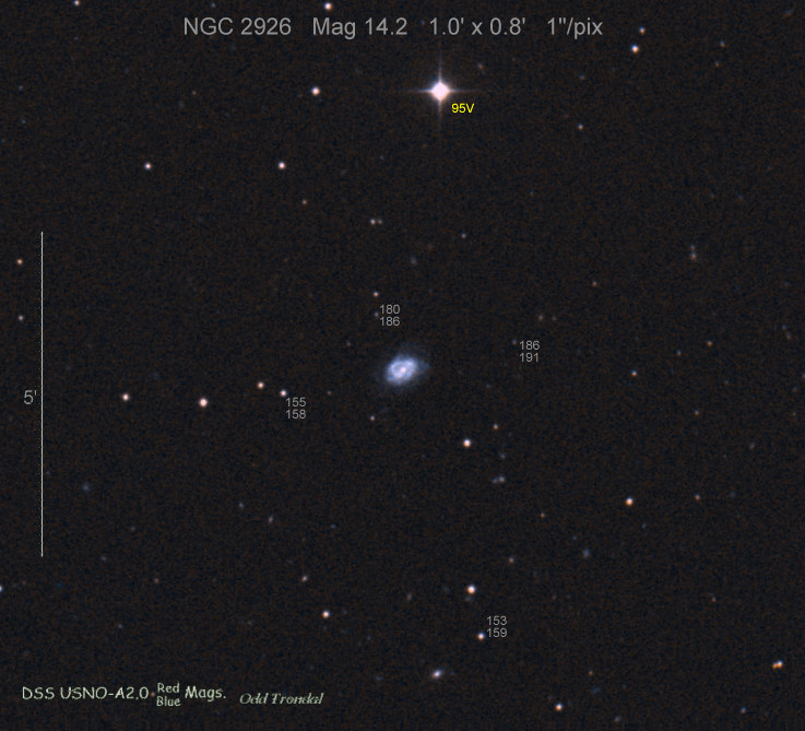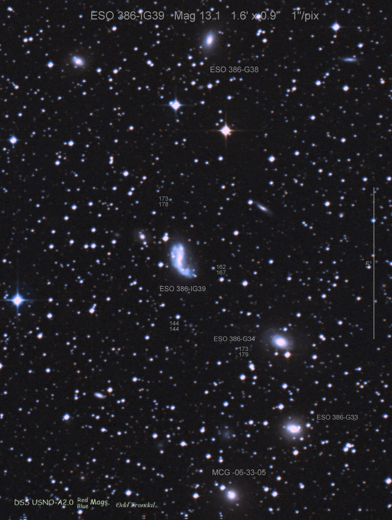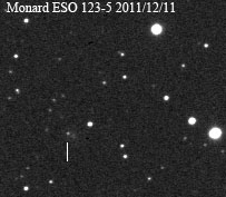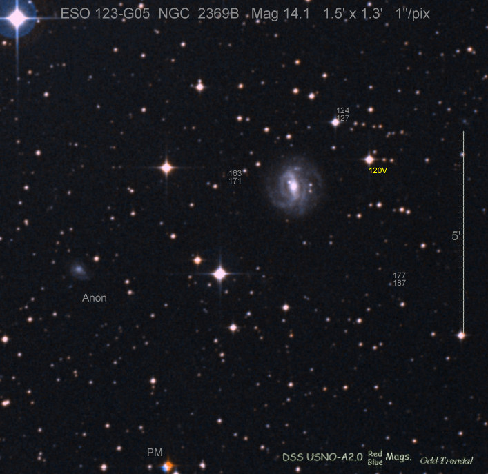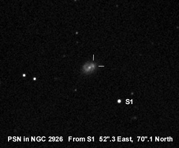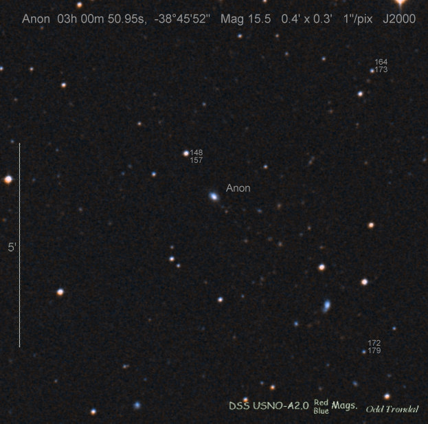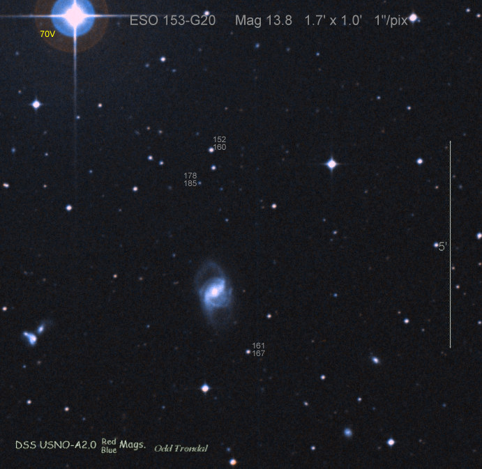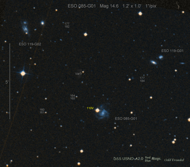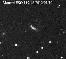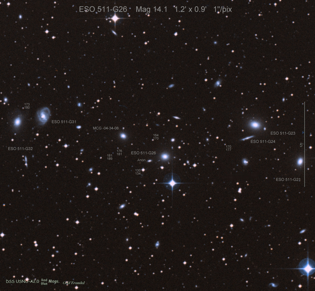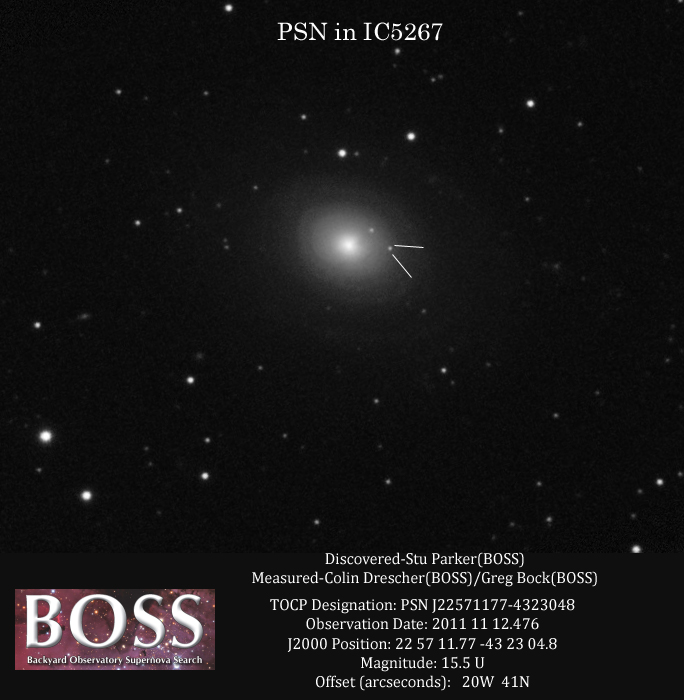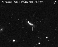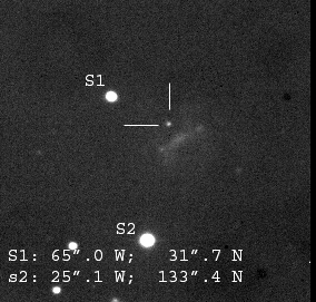 Found in an anonymous galaxy at R.A. = 14h18m56s.08, Decl. = -27°24'56".9 (near ESO 511-G26) Located 15" east and 4" south of the center of the host galaxy (Joseph Brimacombe image) Mag 17.7:1/17, Type unknown  |