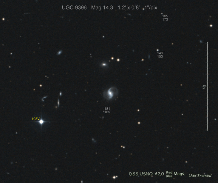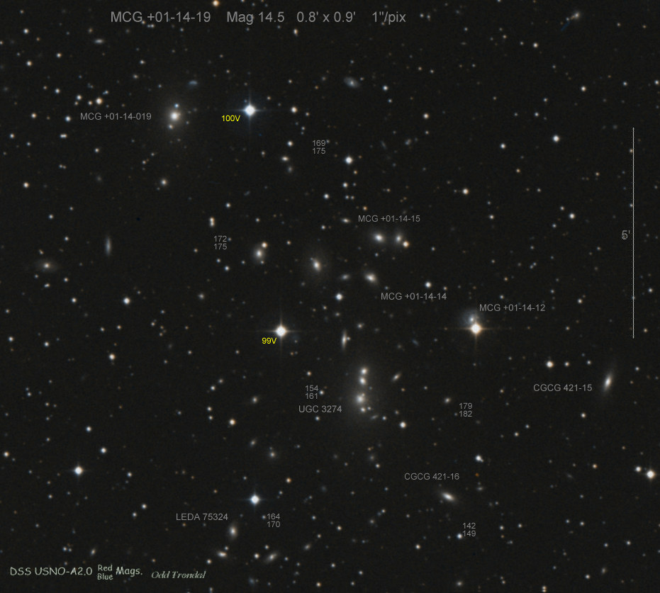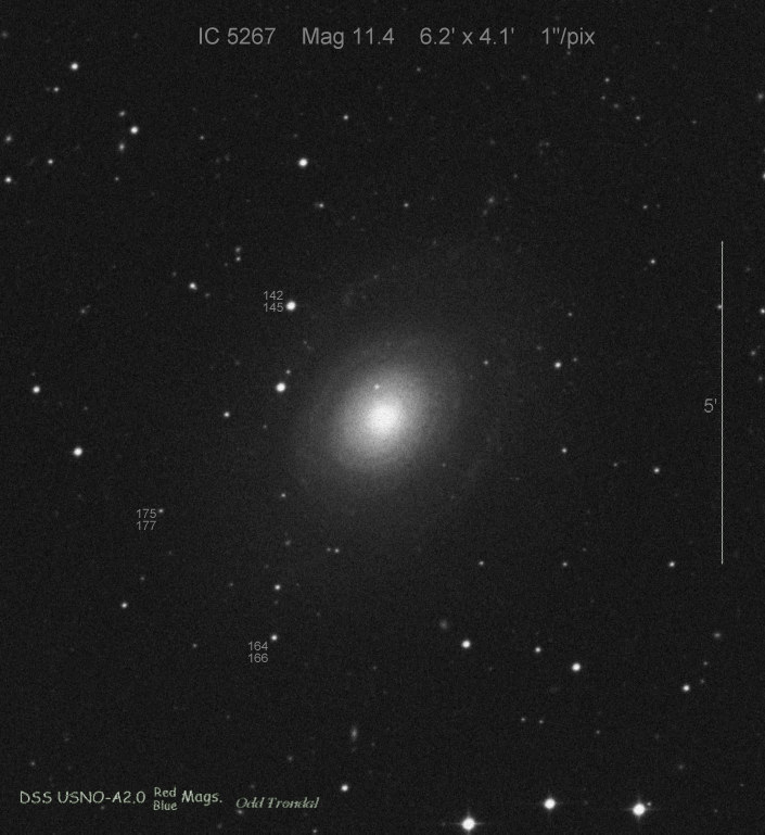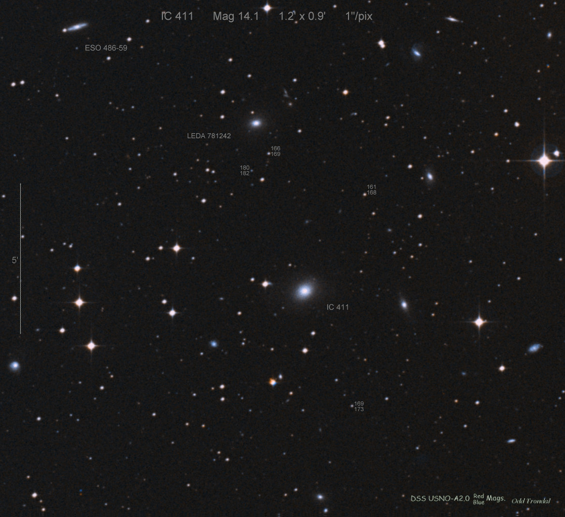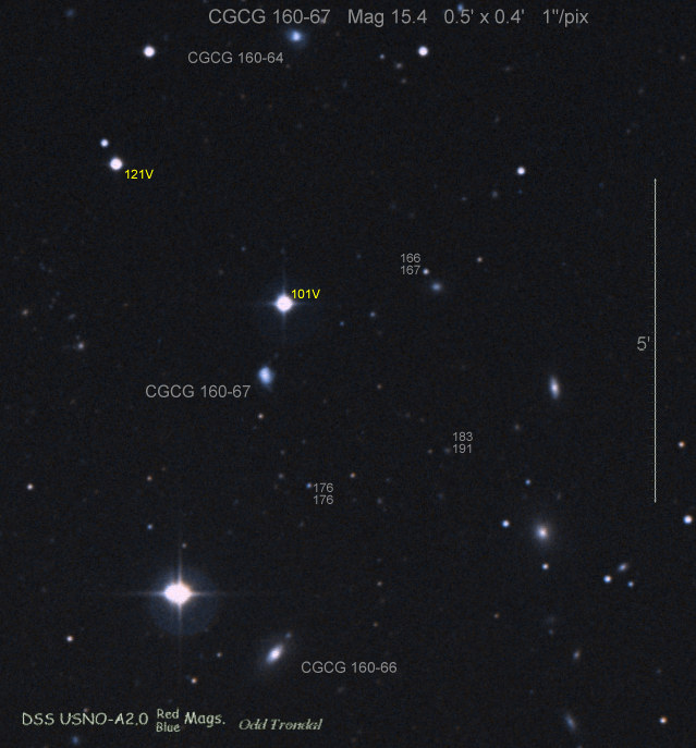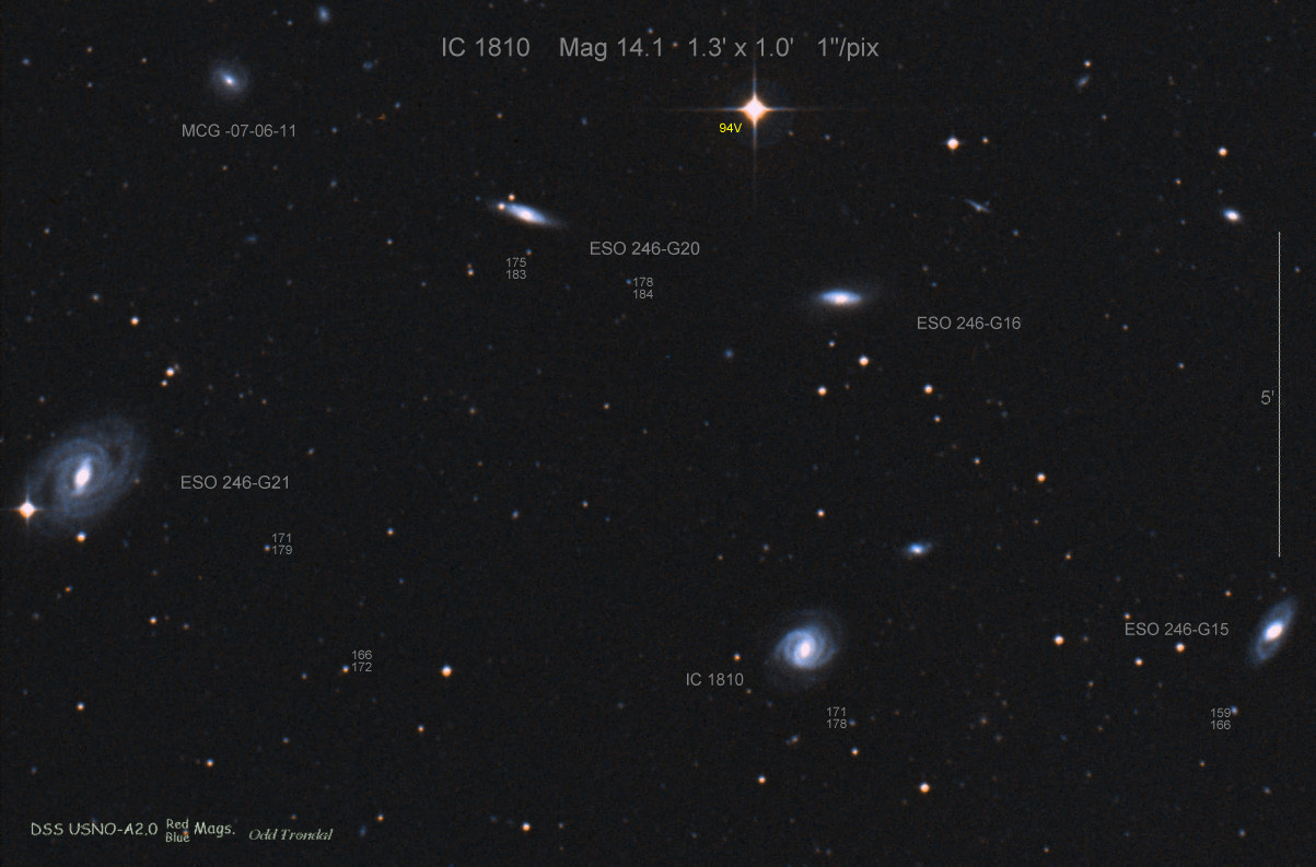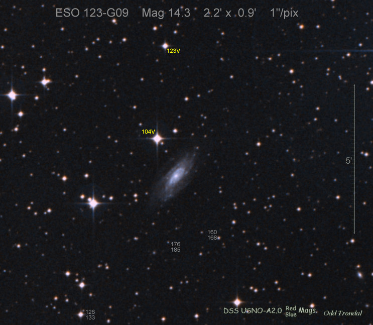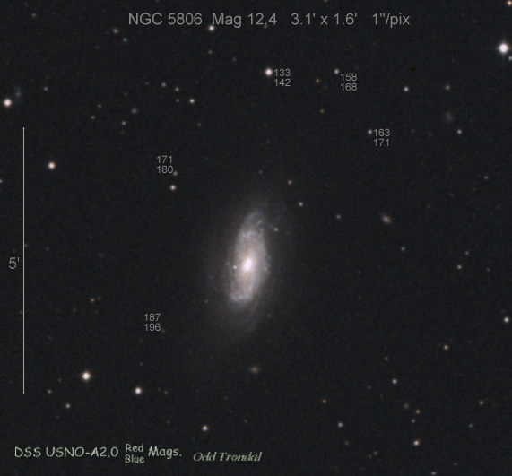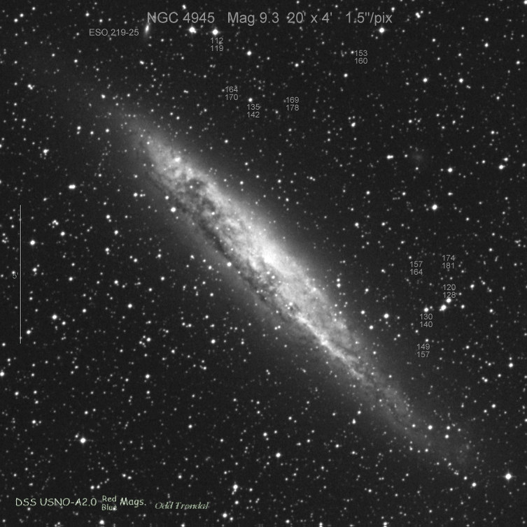 Found in an anonymous galaxy at R.A. = 14h18m56s.08, Decl. = -27°24'56".9 (near ESO 511-G26) Located 15" east and 4" south of the center of the host galaxy (Joseph Brimacombe image) Mag 17.7:1/17, Type unknown  |