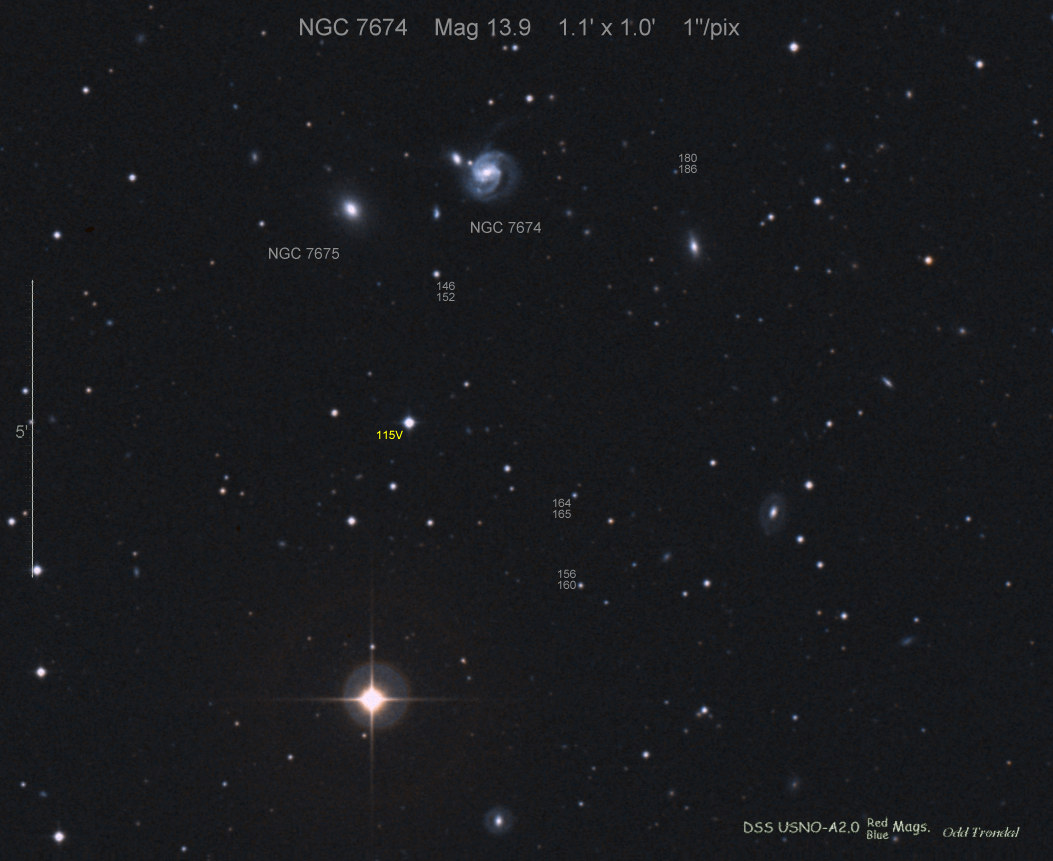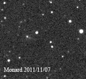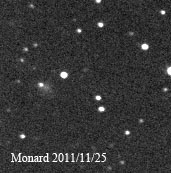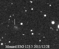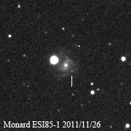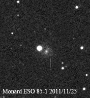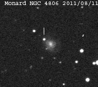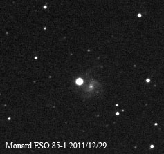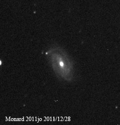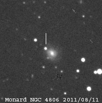 Found in NGC 7674 at R.A. = 23h27m55s.50, Decl. = +08°46'45".7 Located 18" west and 1" north of the center of NGC 7674 (Discovery image) (Stan Howerton image) (Leonid Elenin image) (William Wiethoff image) (Diego Rodríguez image) (Stan Howerton image) JM Llapasset image) (Stan Howerton image) (Stan Howerton image) (Stan Howerton image) Mag 17.6:12/25 (16.5:11/18), Type Ia (References: (CBET 2877 corrected) (CBET 2880 corrected) CBAT TOCP SN 2011ee)  |