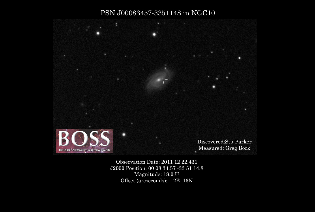 Found in UGC 1626 at R.A. = 02h08m21s.40, Decl. = +41°29'12".3 Located 2" west and 26" north of the center of UGC 1626 (Discovery image) Mag 18.4:1/19 (15.8:9/23), Type II (References: CBAT TOCP) 2011fu images sub-page  |